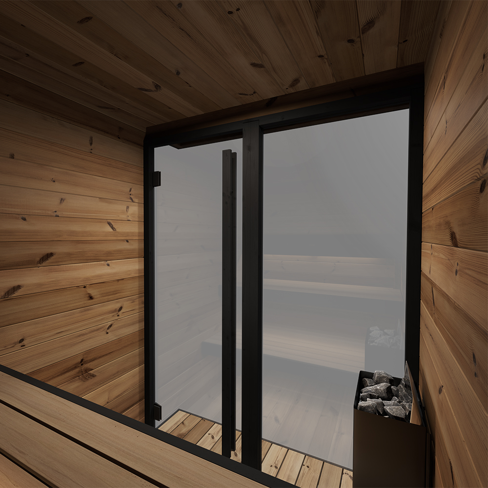 Bunnrammen er brunimpregnert og fungerer som et robust fundament. Innvendig finnes to badstubenker og ryggstøtte i Thermo Aspen med sortmalte frontpaneler. Taket dekkes med selvklebende takpapp og sorte beslag som beskytter mot vær og vind.