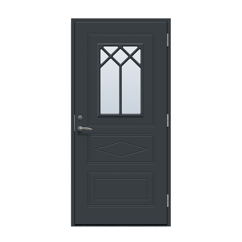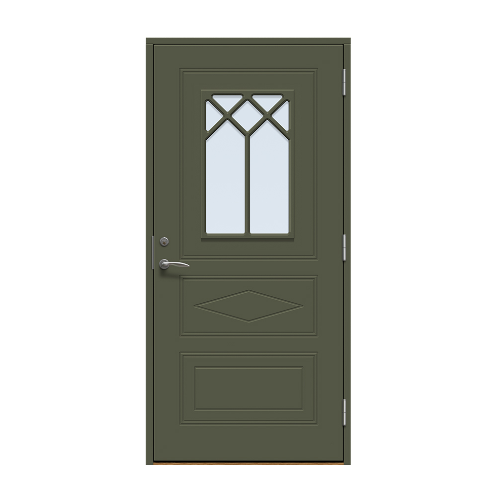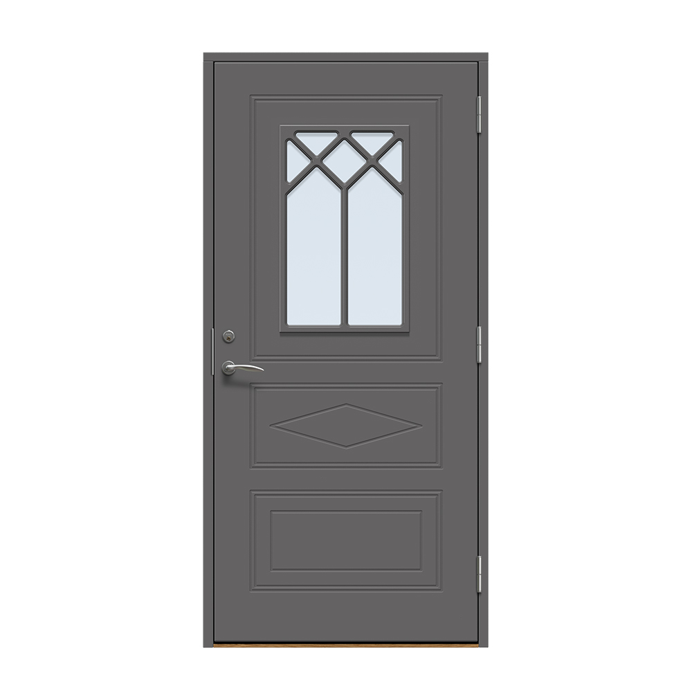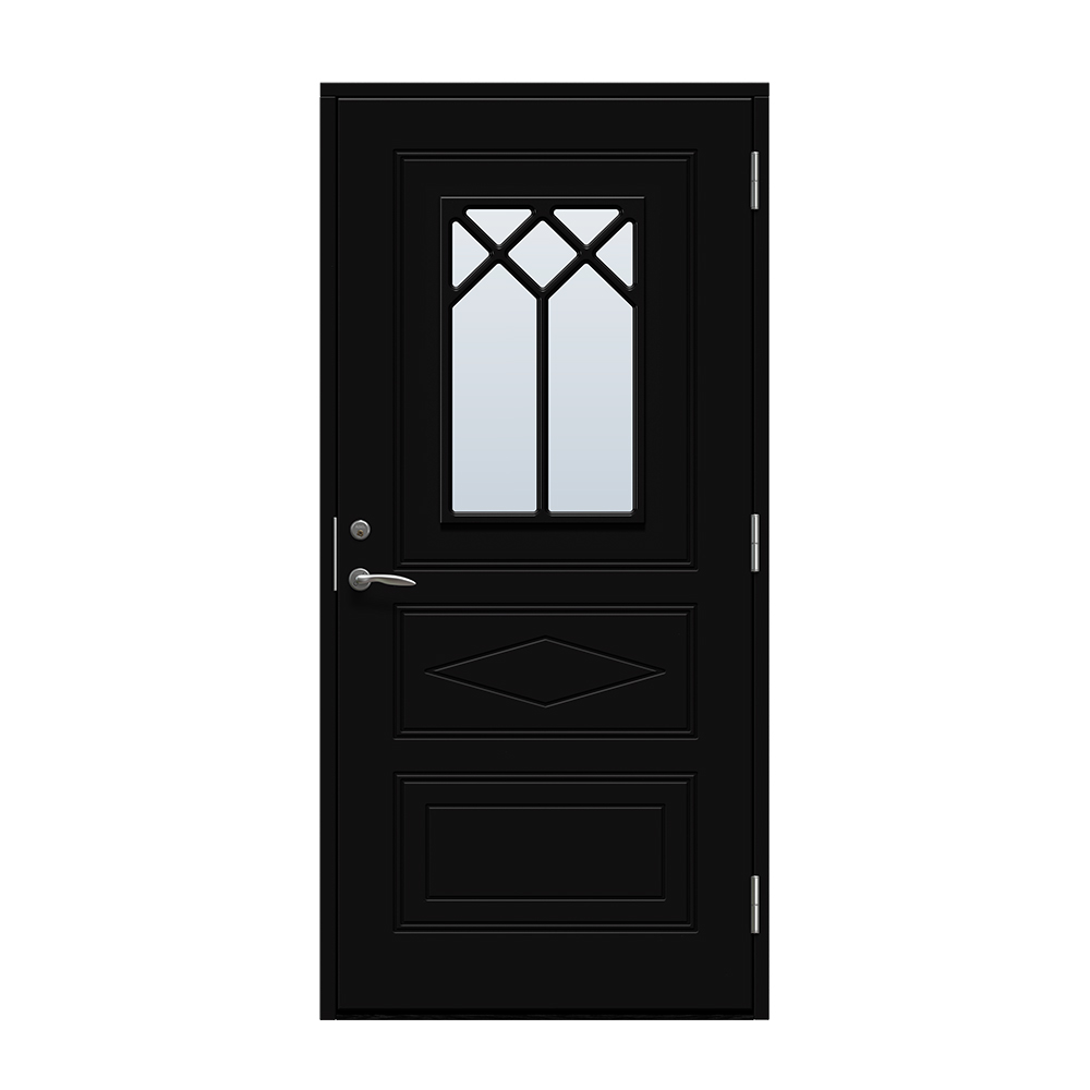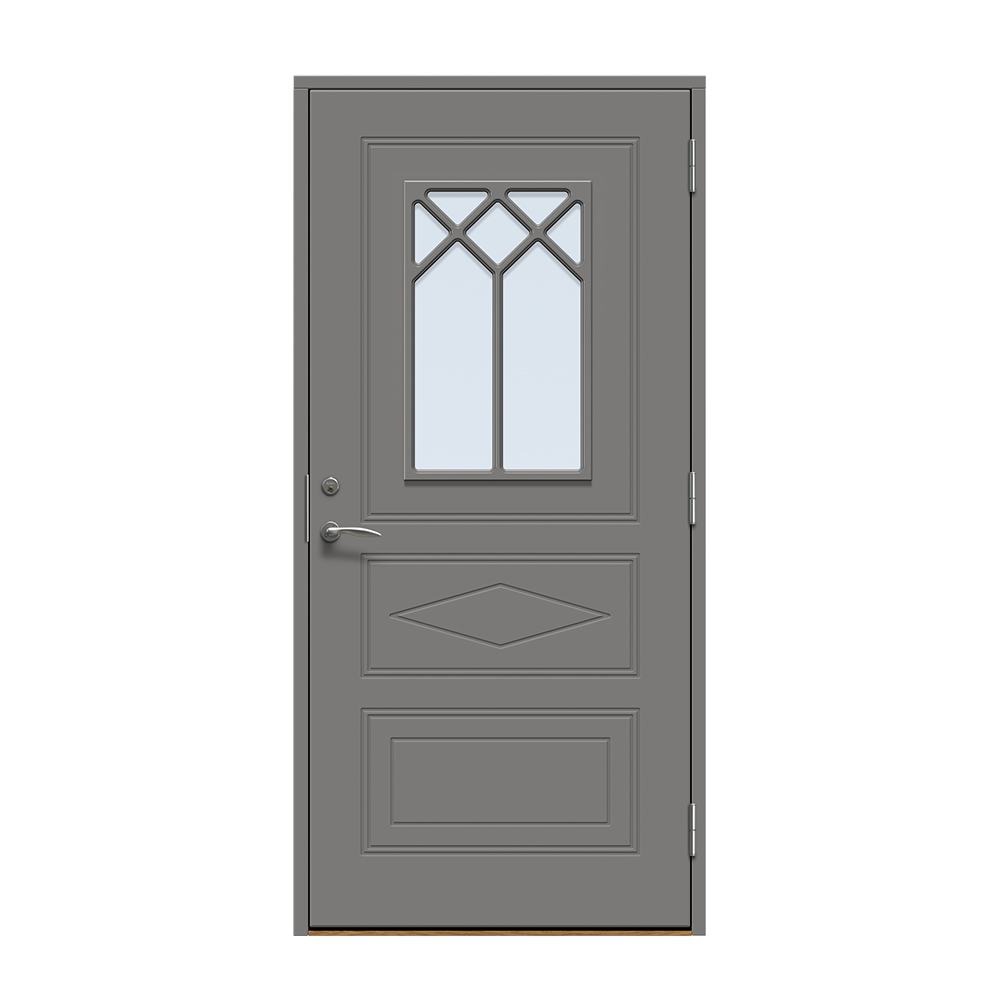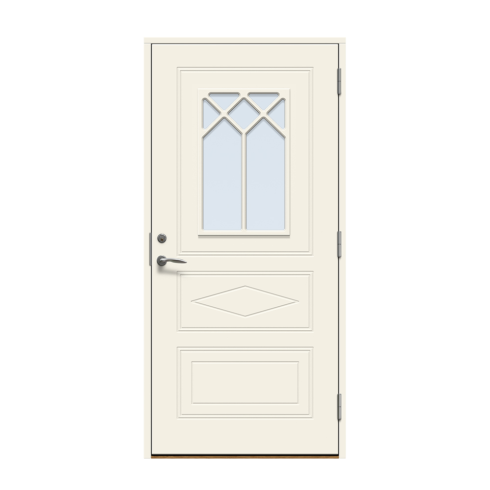 Fleninge er en inngangsdør med et sprosset vindu og vakker dekor på dørbladet. Døren har en glatt innside.
