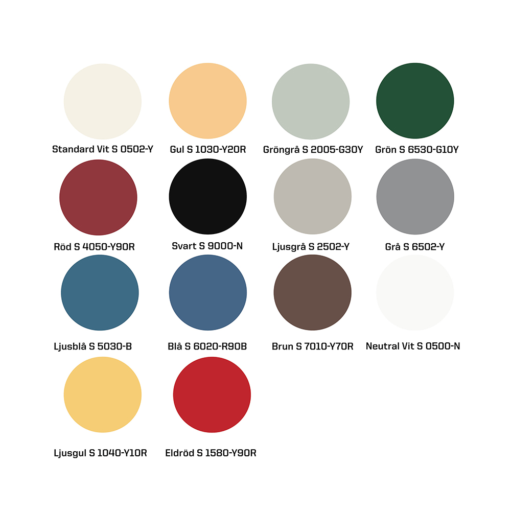 Døren er tilgjengelig i standard hvit S 0502-Y, nøytral hvit S 0500-N, rød S 4050-R, grå S 6502-Y, grønn 6530-G10Y, grønngrå S 2005-G30Y, blå S6020-R90B, gul S1030-Y20R, lys gul S1040-Y10R og svart S 9000-N.