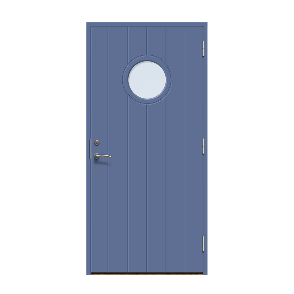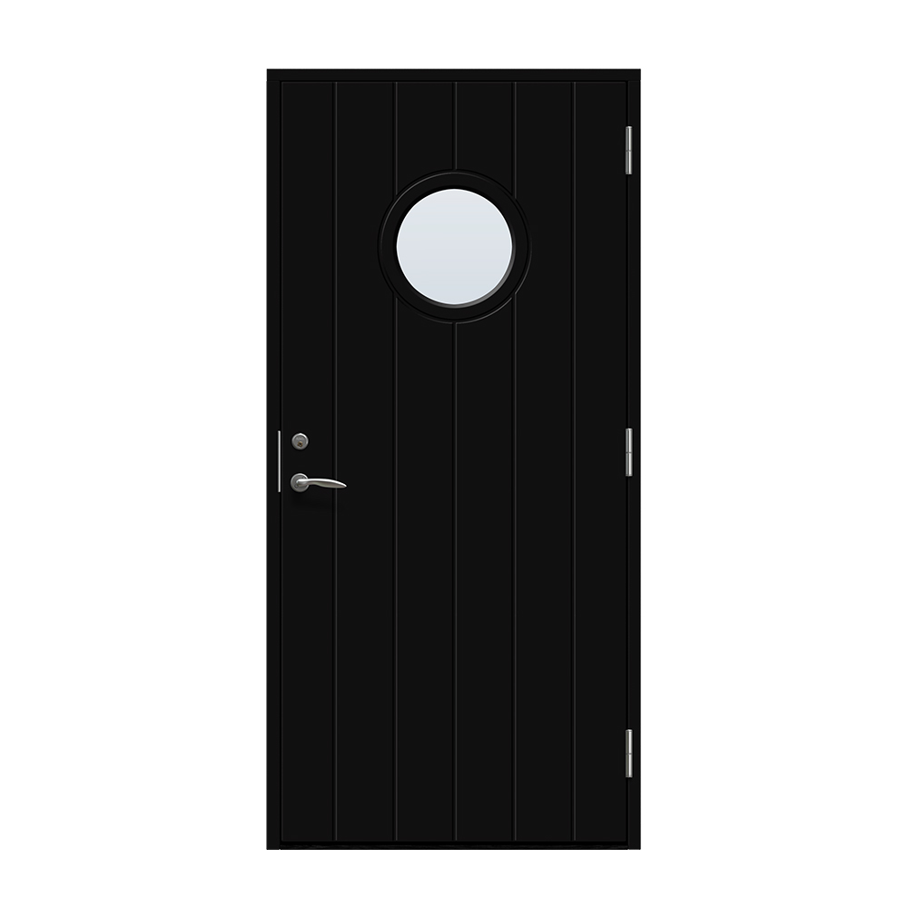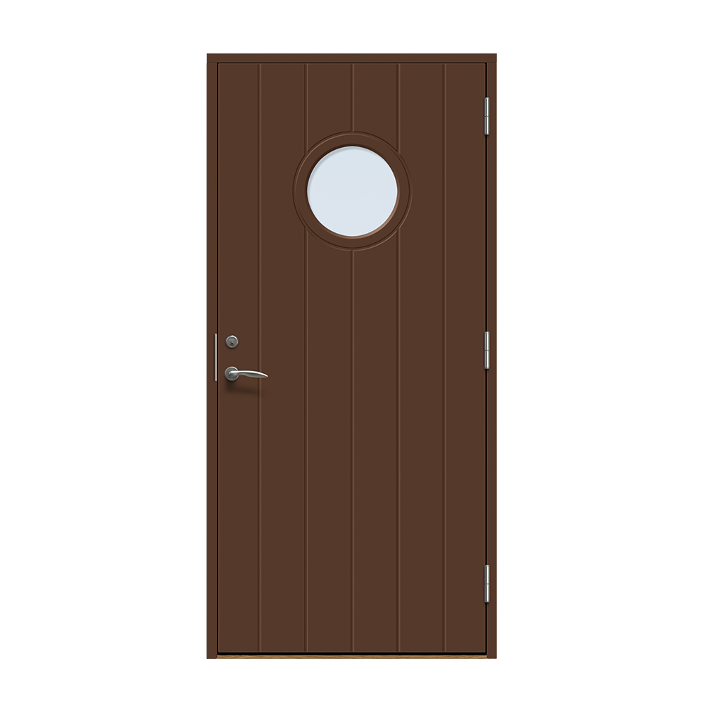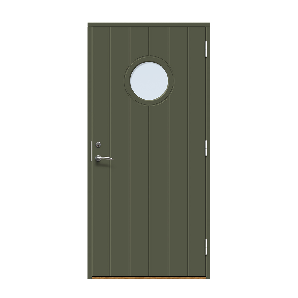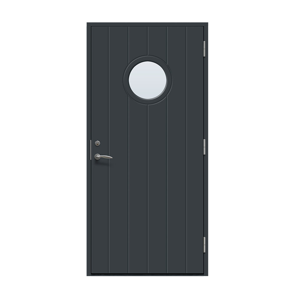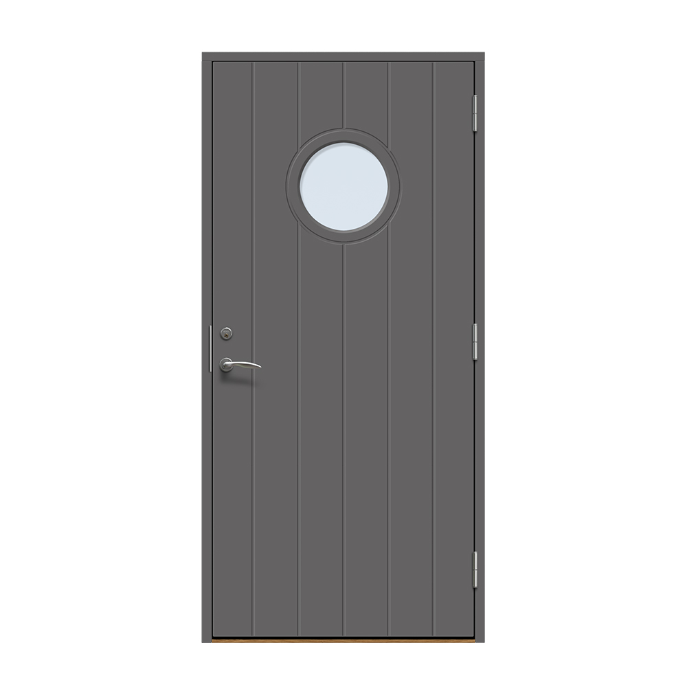Orust er en inngangsdør med et rundt karnappvindu og sporfrest eksteriør.