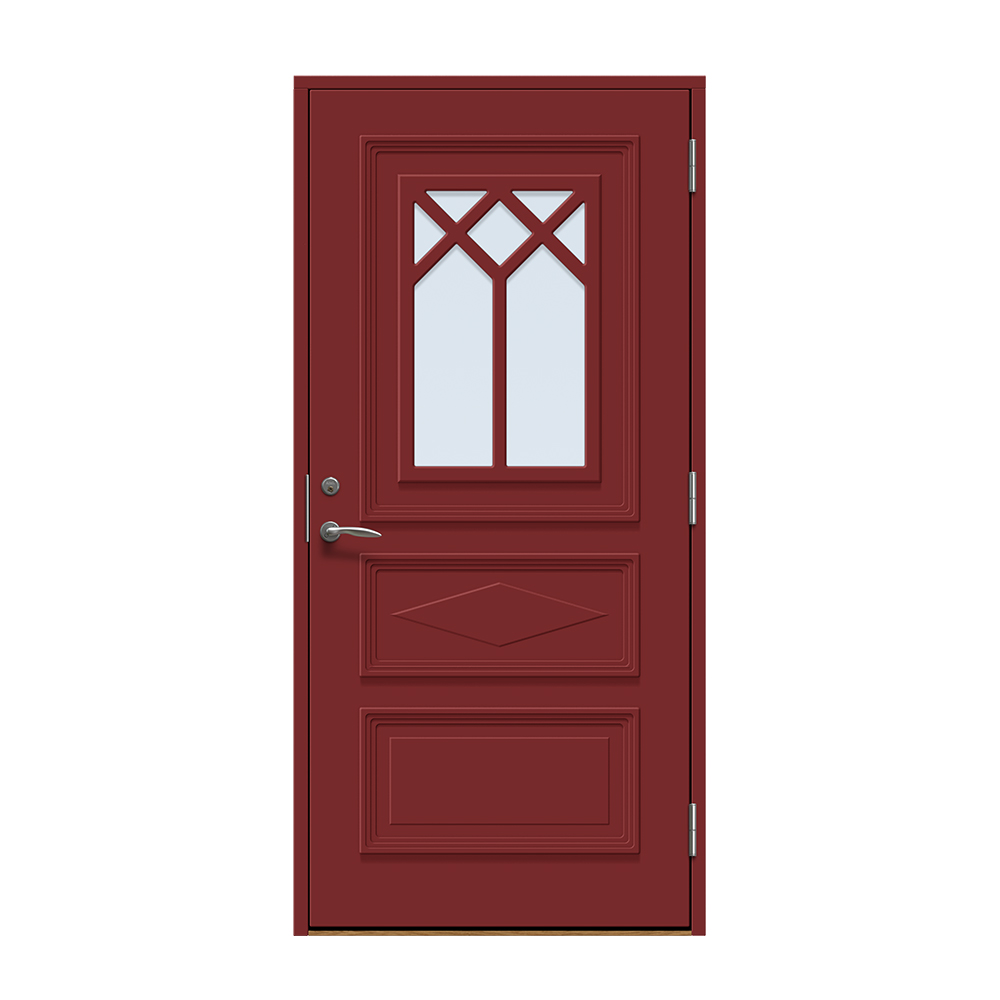 Pålsjø er en entrédør med et sprosset vindu, stilrene dekorer på utsiden og glatt innside.