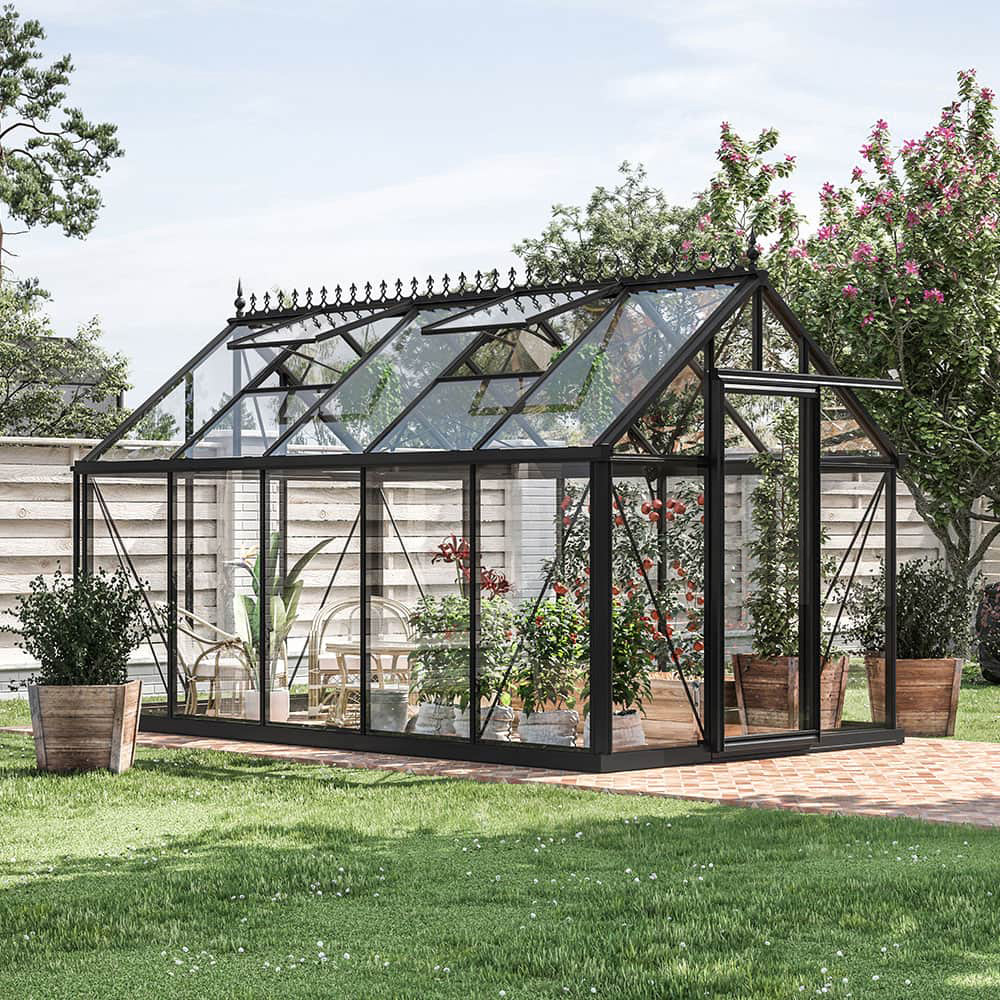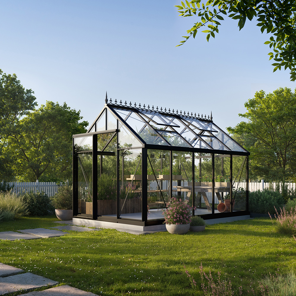 Velg drivhus i ubehandlet aluminium eller victorian med sort pulverlakkering. Takpynten er ikke inkludert, men finnes som tilbehør for de svarte modellene.