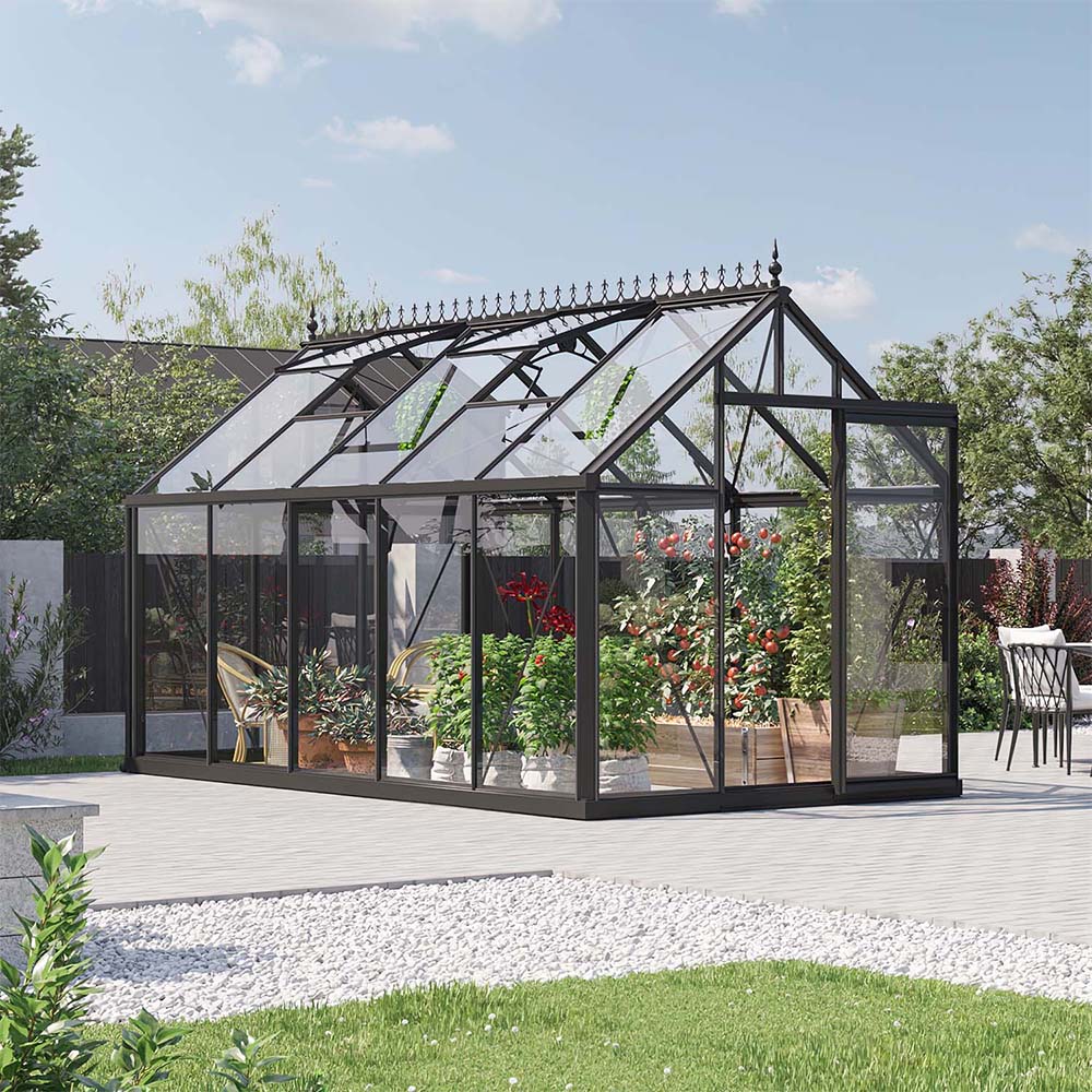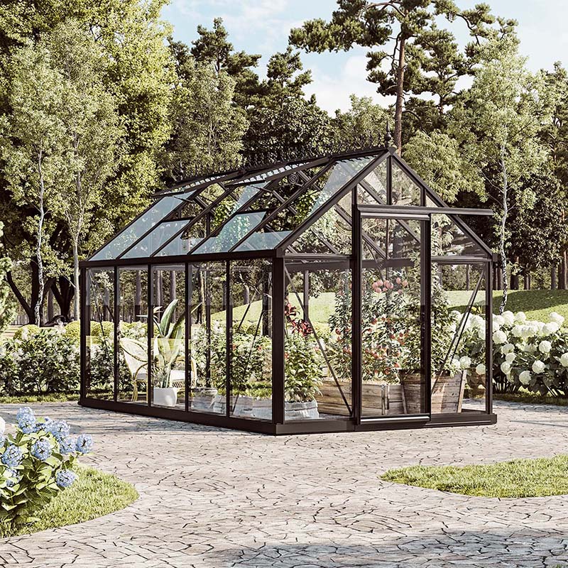 Velg drivhus i ubehandlet aluminium eller victorian med sort pulverlakkering. Takpynten er ikke inkludert, men finnes som tilbehør for de svarte modellene.