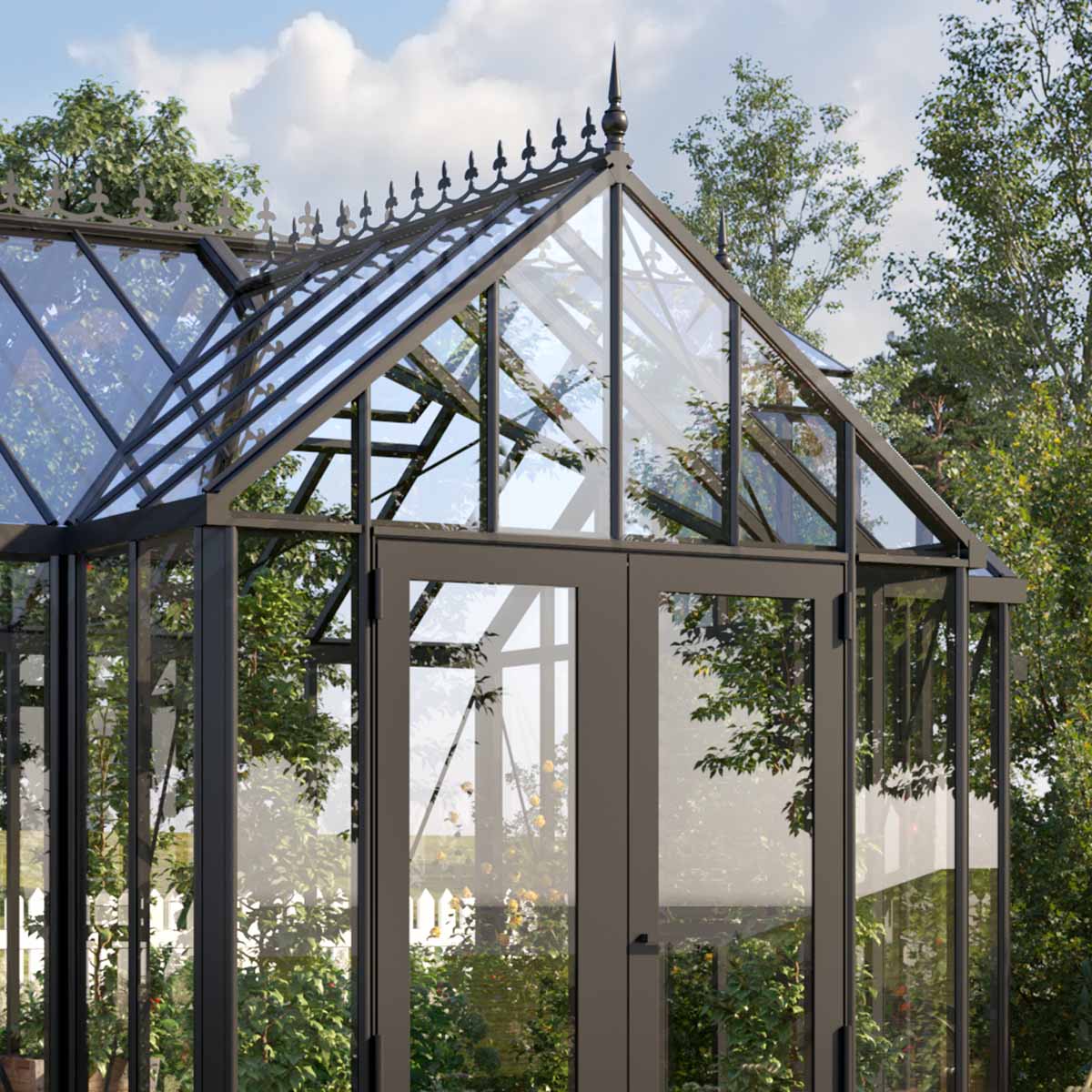 Oasis Royal T kommer med sort eller hvit pulverlakkering. Takpynten er ikke inkludert, men finnes som tilbehør. Benytt gjerne anledningen til å gjøre drivhuset ditt enda mer personlig med noe av vårt øvrige tilbehør.
