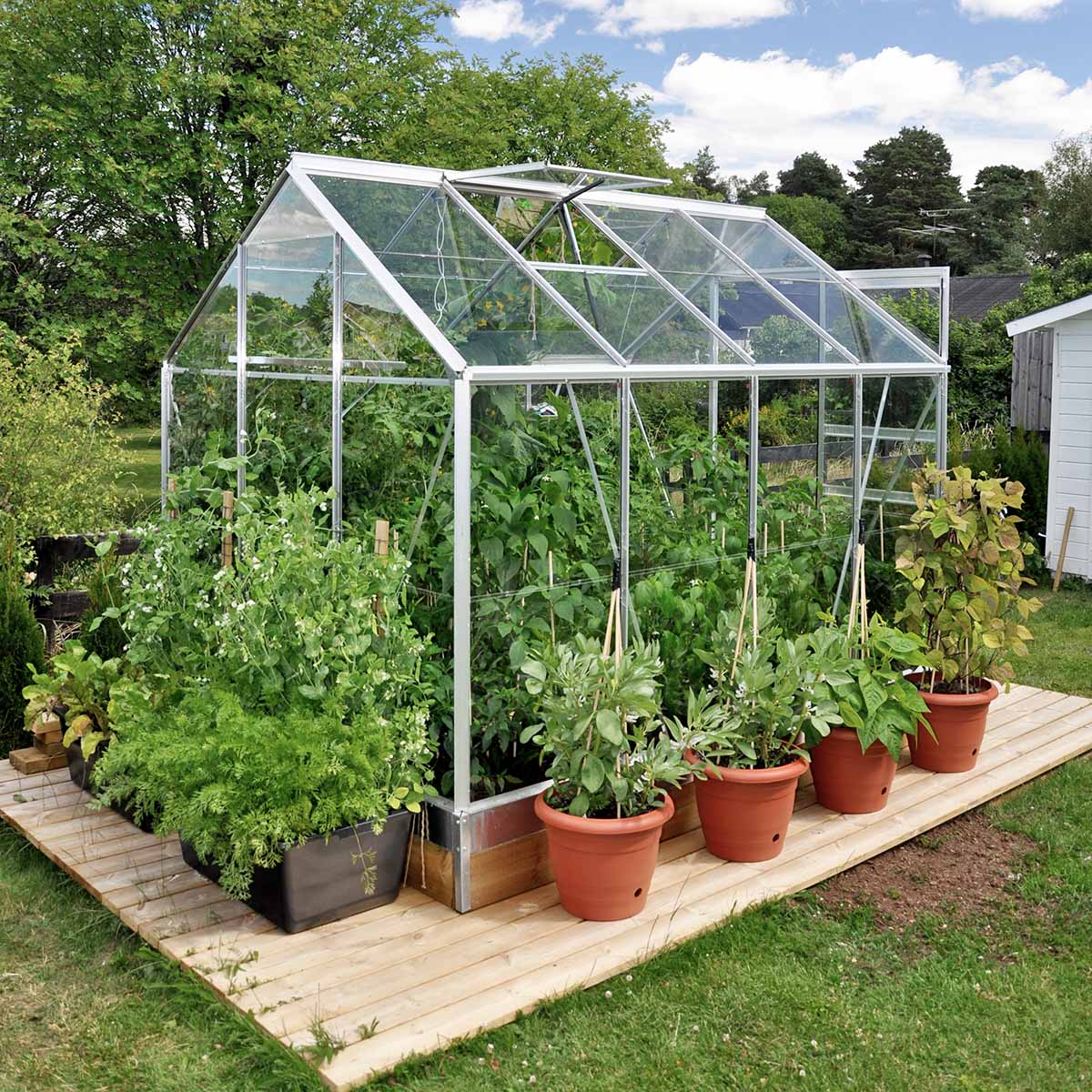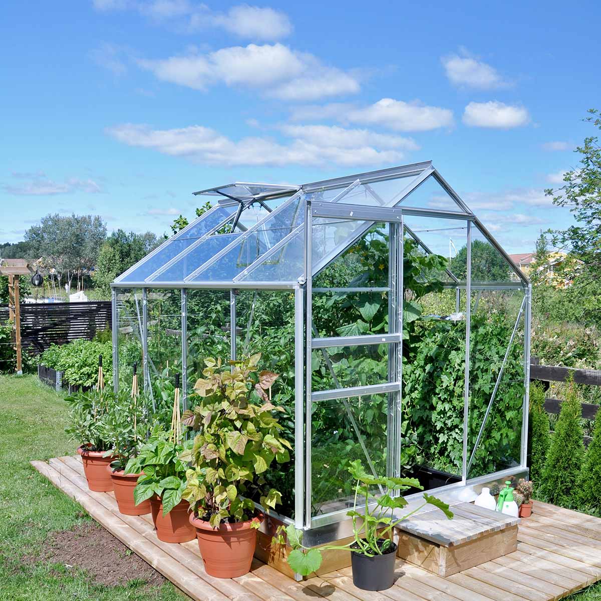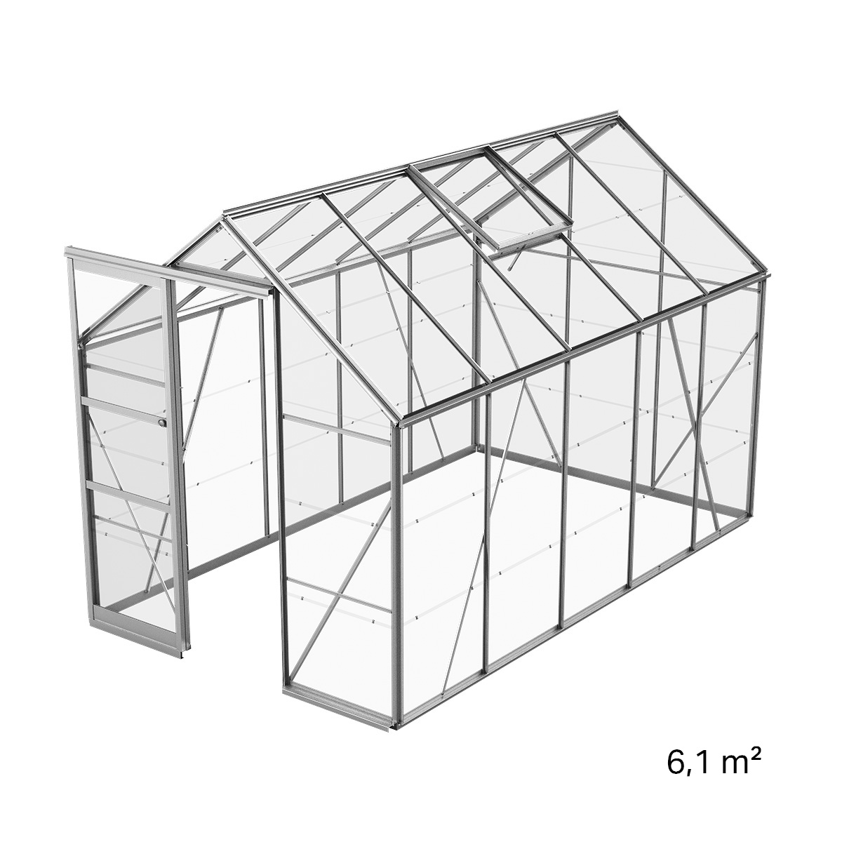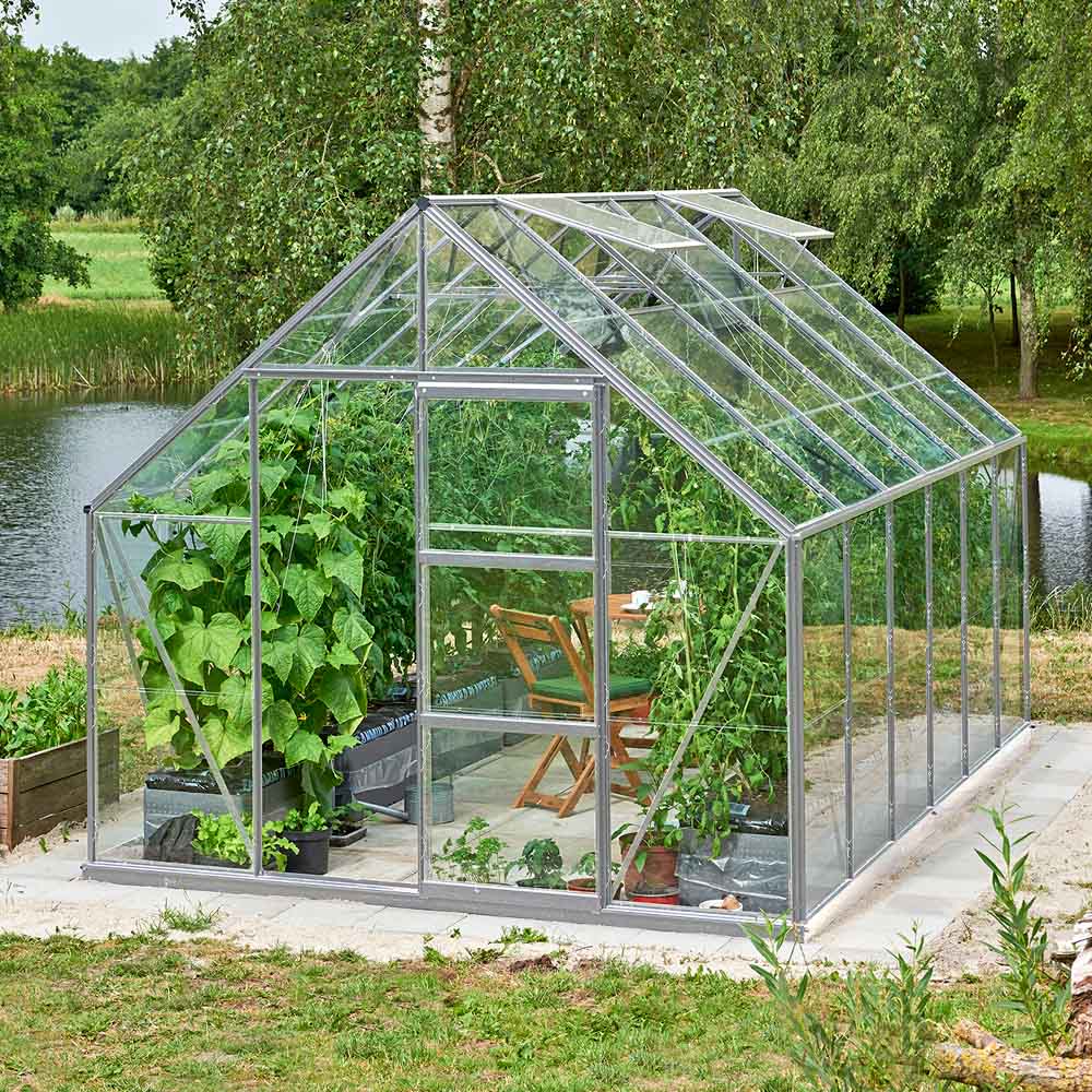 Den klassiske formen gjør drivhuset lett å plassere i hagen, og skyvedøren i gavlen er smidig å bruke uten å kreve ekstra svingplass. Takvindu med manuell åpning og integrerte takrenner er inkludert, slik at du får en gjennomtenkt og funksjonell helhet fra start.