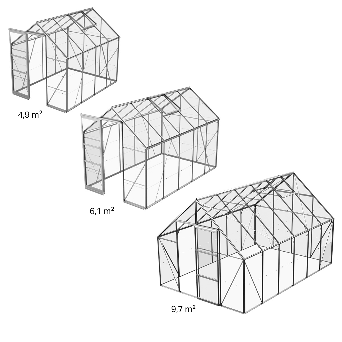 Drivhusene i størrelsen 3,7 m², 5,0 m² og 6,2 m² har 4 mm kanalplast, mens størrelsen på 9,9 m² har 6 mm.