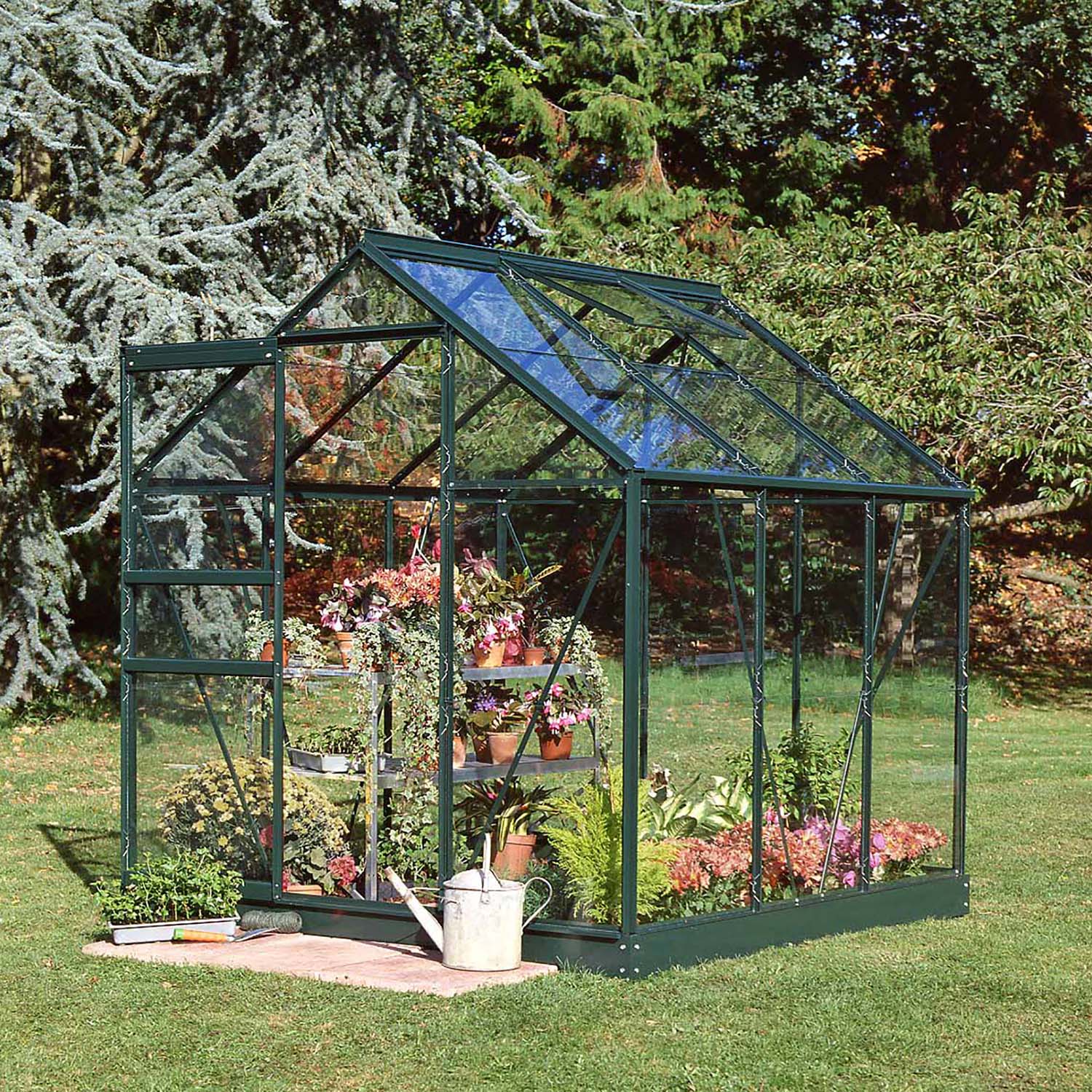 Den klassiske formen gjør drivhuset lett å plassere i hagen, og skyvedøren i gavlen er smidig å bruke uten å kreve ekstra svingplass. Den pulverlakkerte konstruksjonen i grønt gir et stilrent uttrykk og en slitesterk overflate som tåler vær og vind. Takvindu med manuell åpning og integrerte takrenner er inkludert, slik at du får en gjennomtenkt og funksjonell helhet fra start.