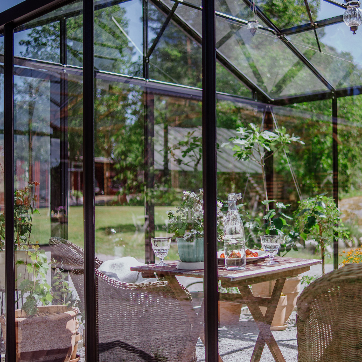 Drivhuset kommer i et stilrent, sortlakkert aluminiumreisverk (RAL9005) og 4 mm sikkerhetsglass i både vegger og tak. Lakken er en strukturlakk som både er mer holdbar og gir et finere resultat