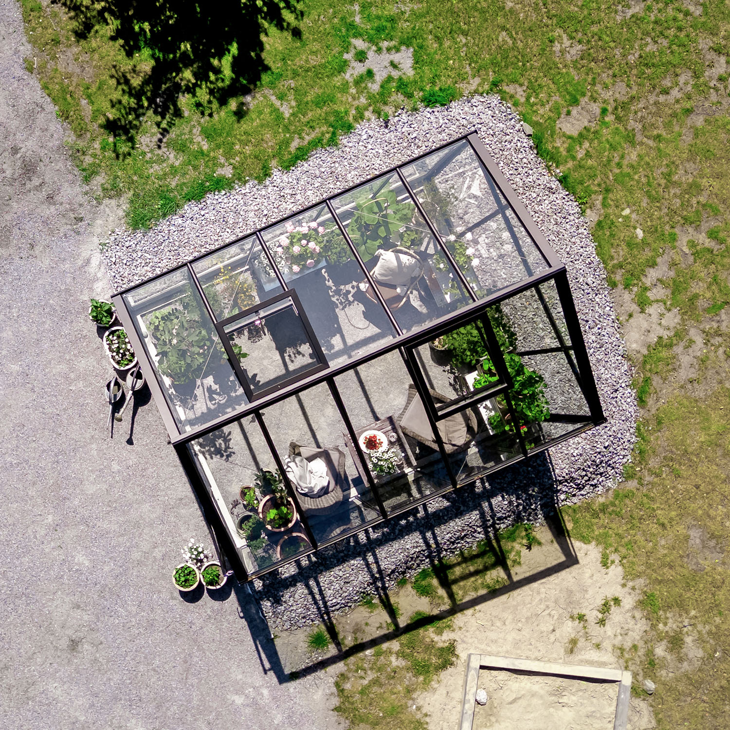 16,5 m² - 4 glassfelt på kortsiden og 7 på langsiden, 2 åpningsbare takluker.