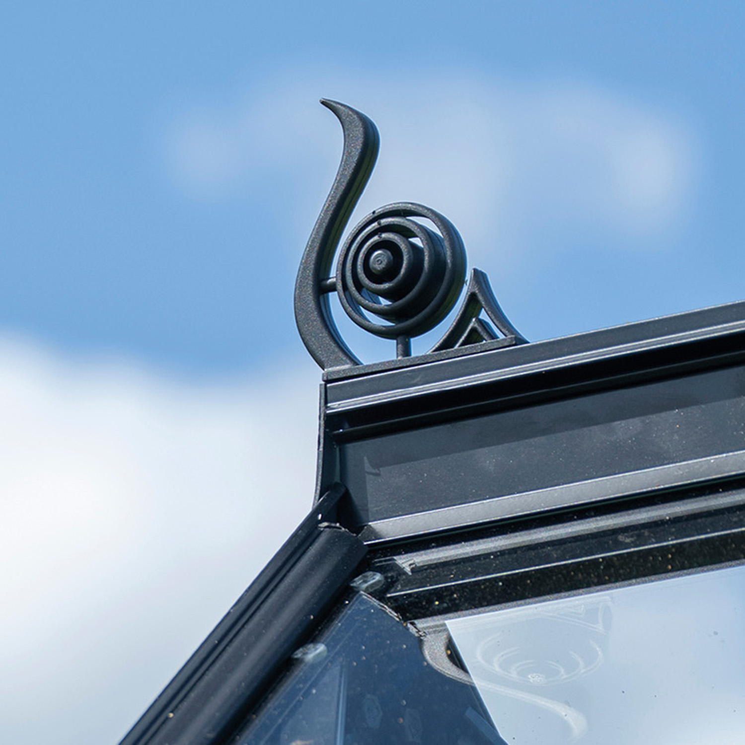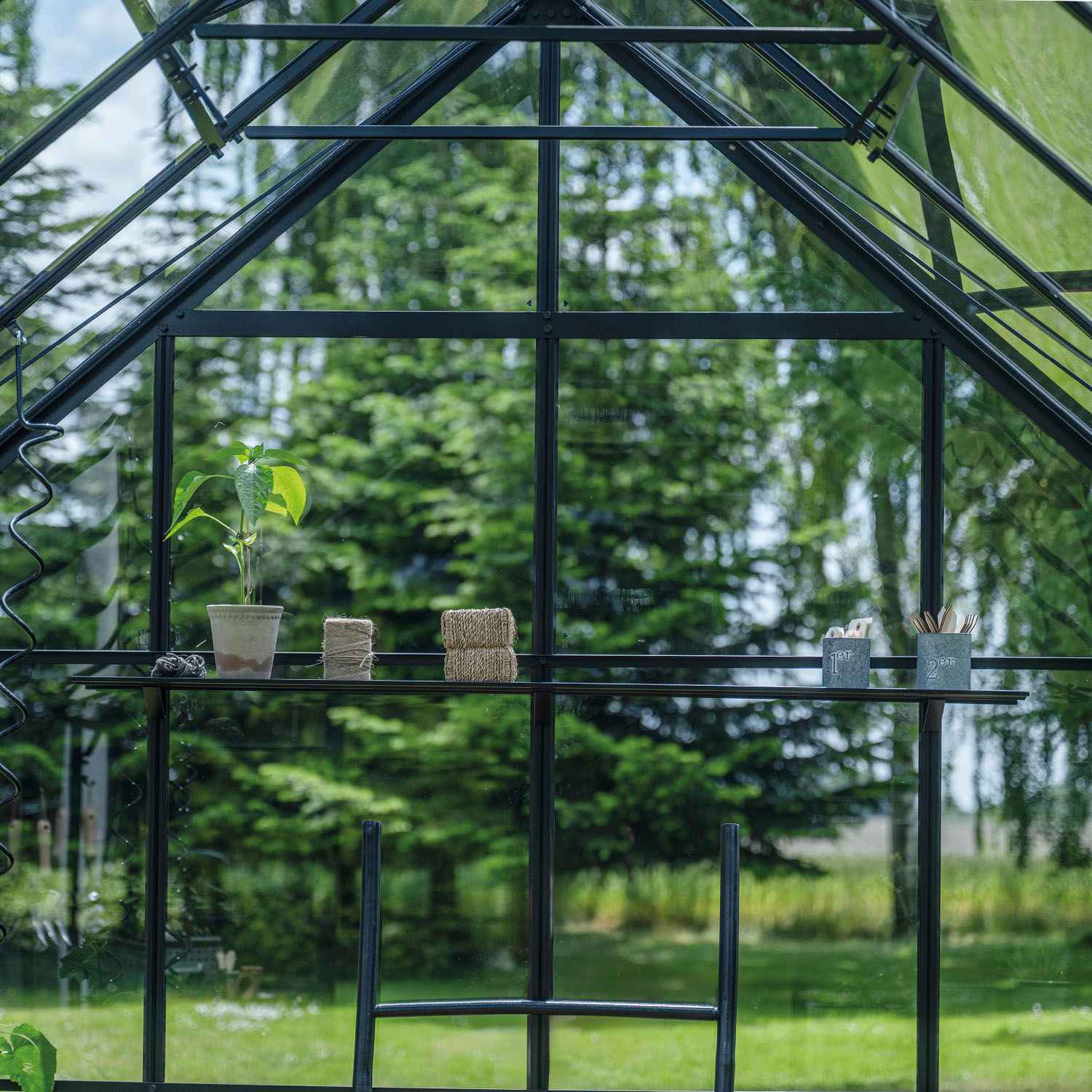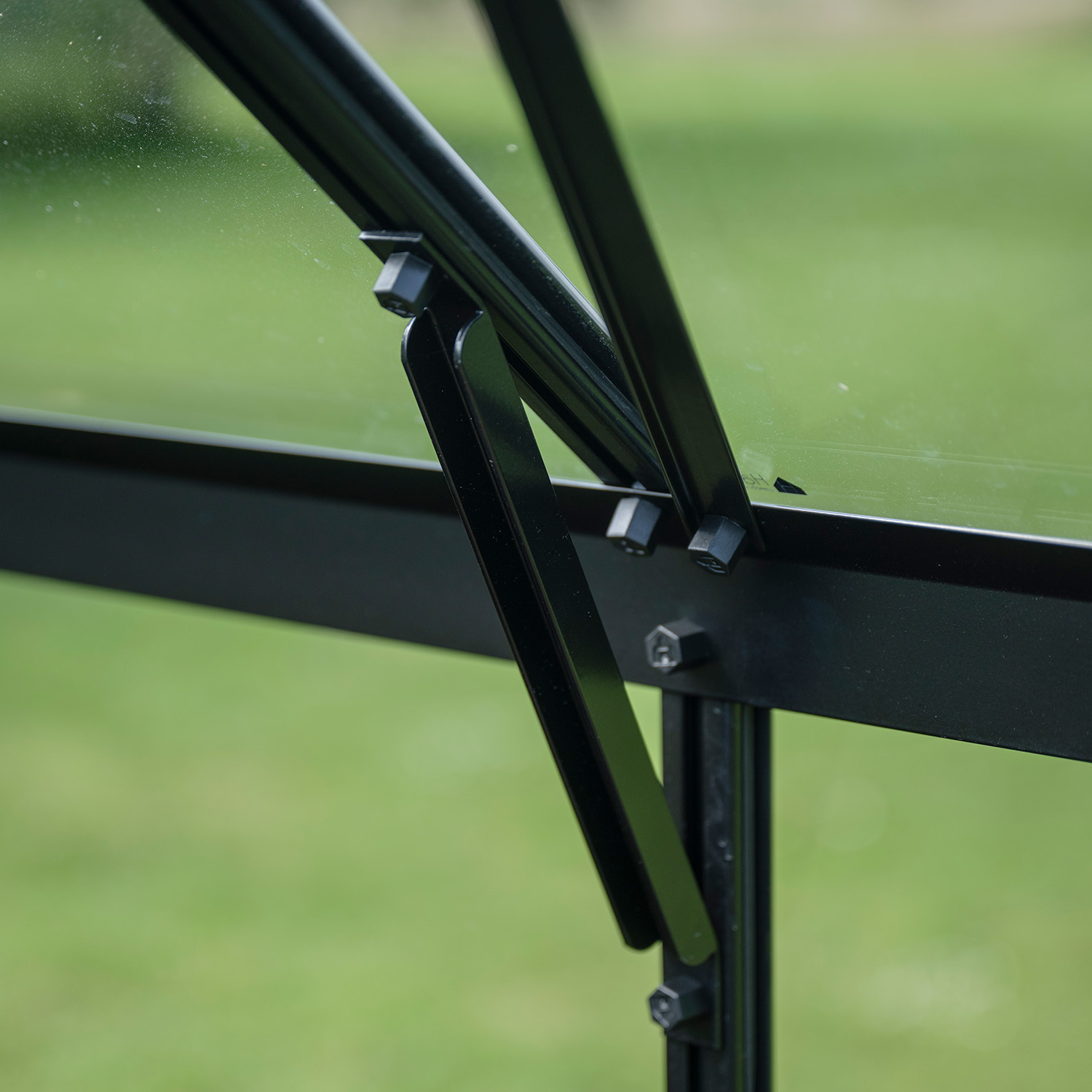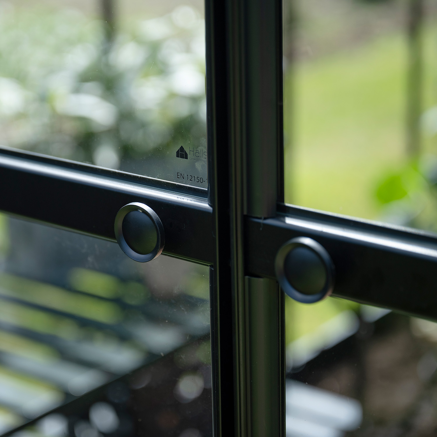 Velger du et drivhus med sikkerhetsglass, kan du oppgradere til svarte glasslister i slitesterk plast som erstatter de medfølgende klipsene.