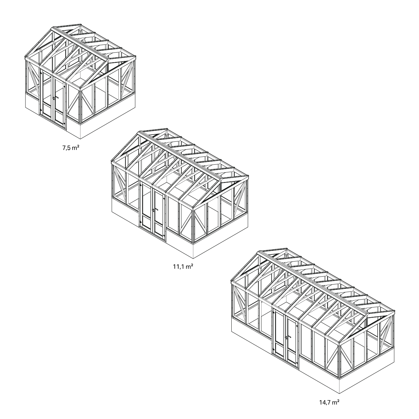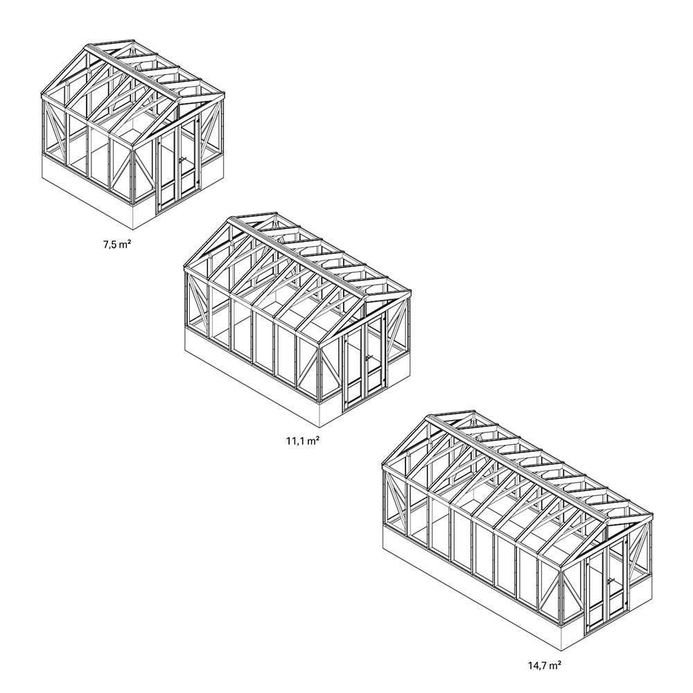 Merk at bildene viser de større modellene av drivhuset.