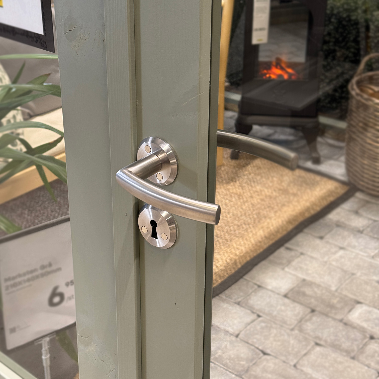 Med sitt slanke design får materialvalgene virkelig skinne. Antallet deler som ikke er av tre eller glass er minimalt, noe som skaper et vakkert helhetsinntrykk. Drivhusets robuste dobbeltdører gir et innbydende preg og gjør det enkelt for deg å stelle plantene dine. Dørene er utstyrt med en låsbar håndtak.
