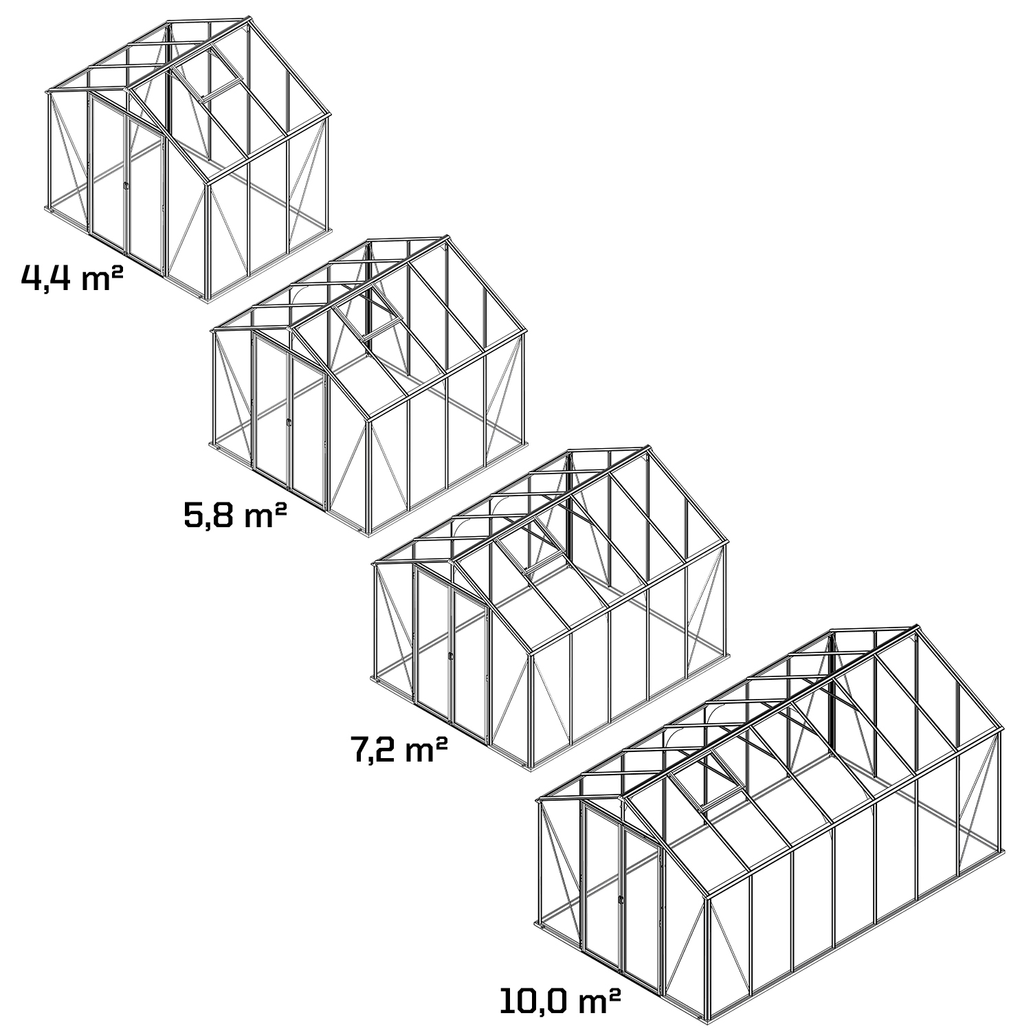Olivia finnes i fire ulike størrelser: 4,4 m², 5,8 m², 7,2 m² og 10,0 m².