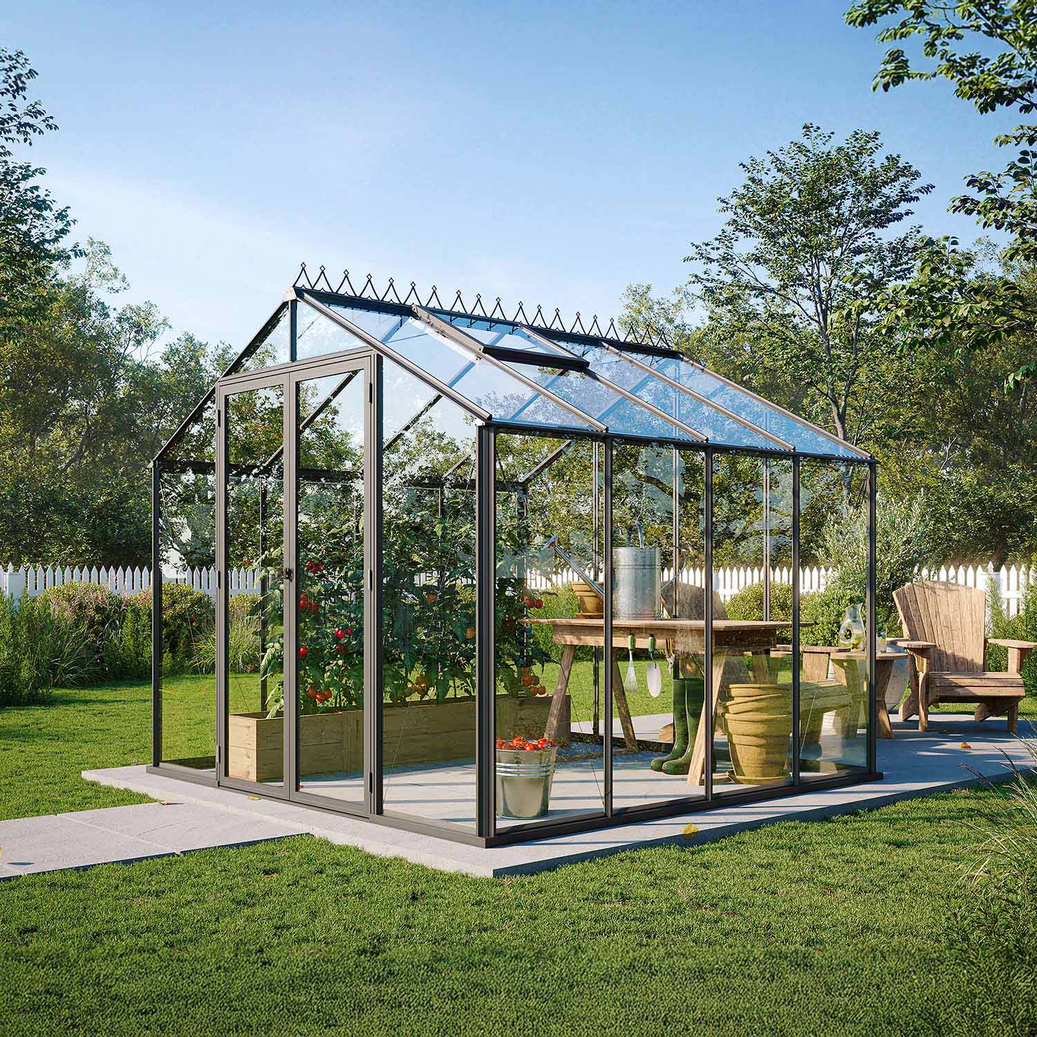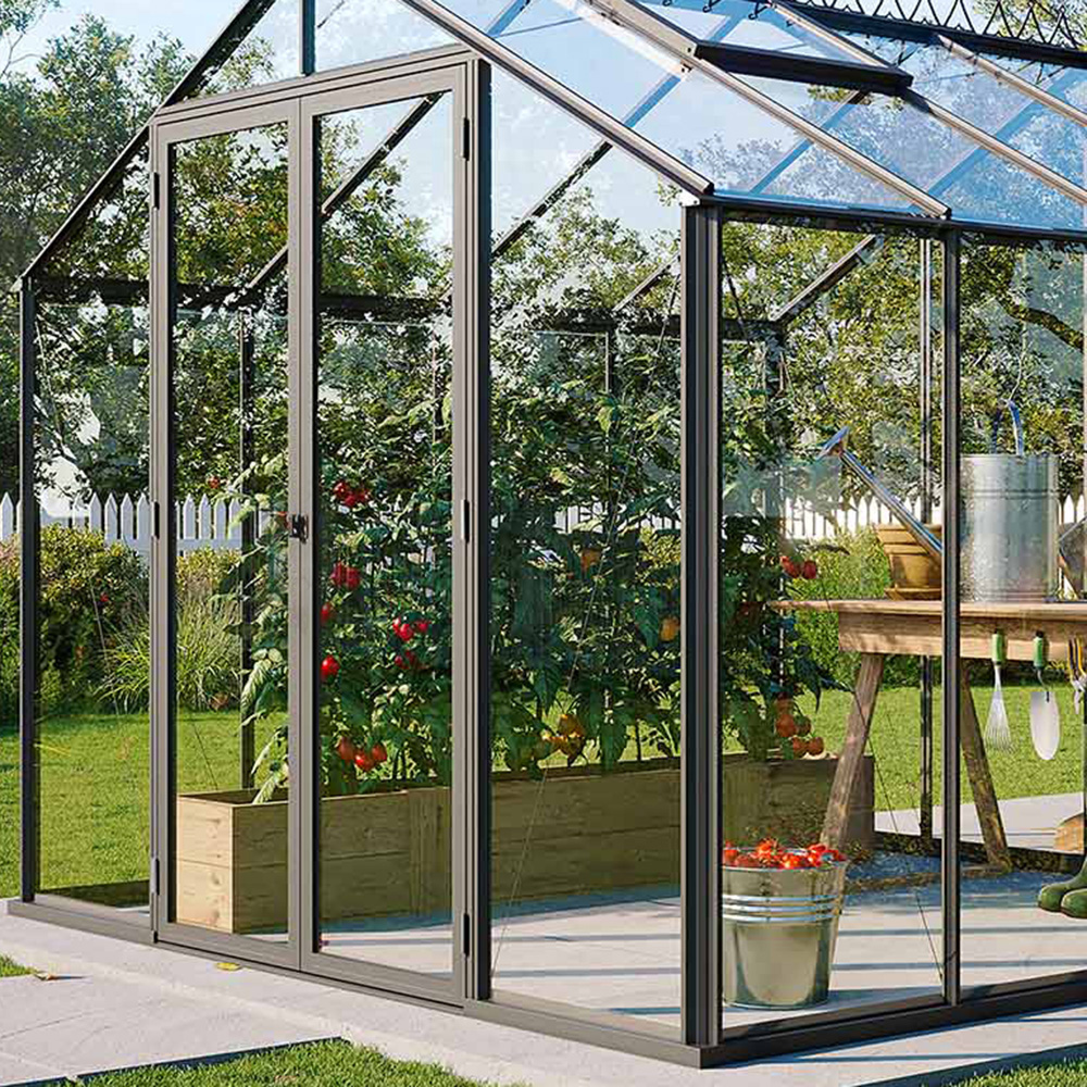 De høye veggene gir en romslig og luftig opplevelse, noe som gjør det behagelig både å dyrke og oppholde seg i drivhuset. Den brede doble døren kan låses med hengelås (følger ikke med), og gjør det enkelt å bære inn planter og hageredskaper – og takket være den lave terskelen er det lett å rulle inn for eksempel en trillebår.