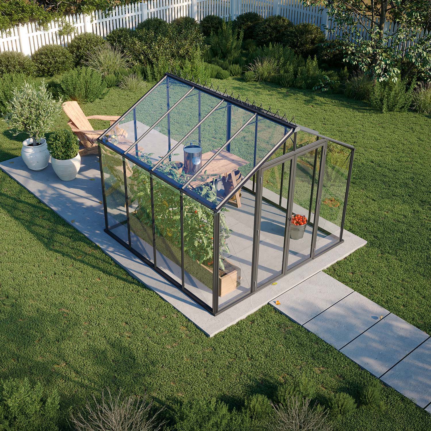 Med sitt moderne formspråk og smarte konstruksjon er Olivia et drivhus som kombinerer design og funksjon på beste vis. Den slake takvinkelen gir drivhuset et stilrent uttrykk, mens den helglassede gavlen – fra bakken til mønet – slipper inn fantastisk lys og skaper en følelse av å være ute, selv når du er inne.
