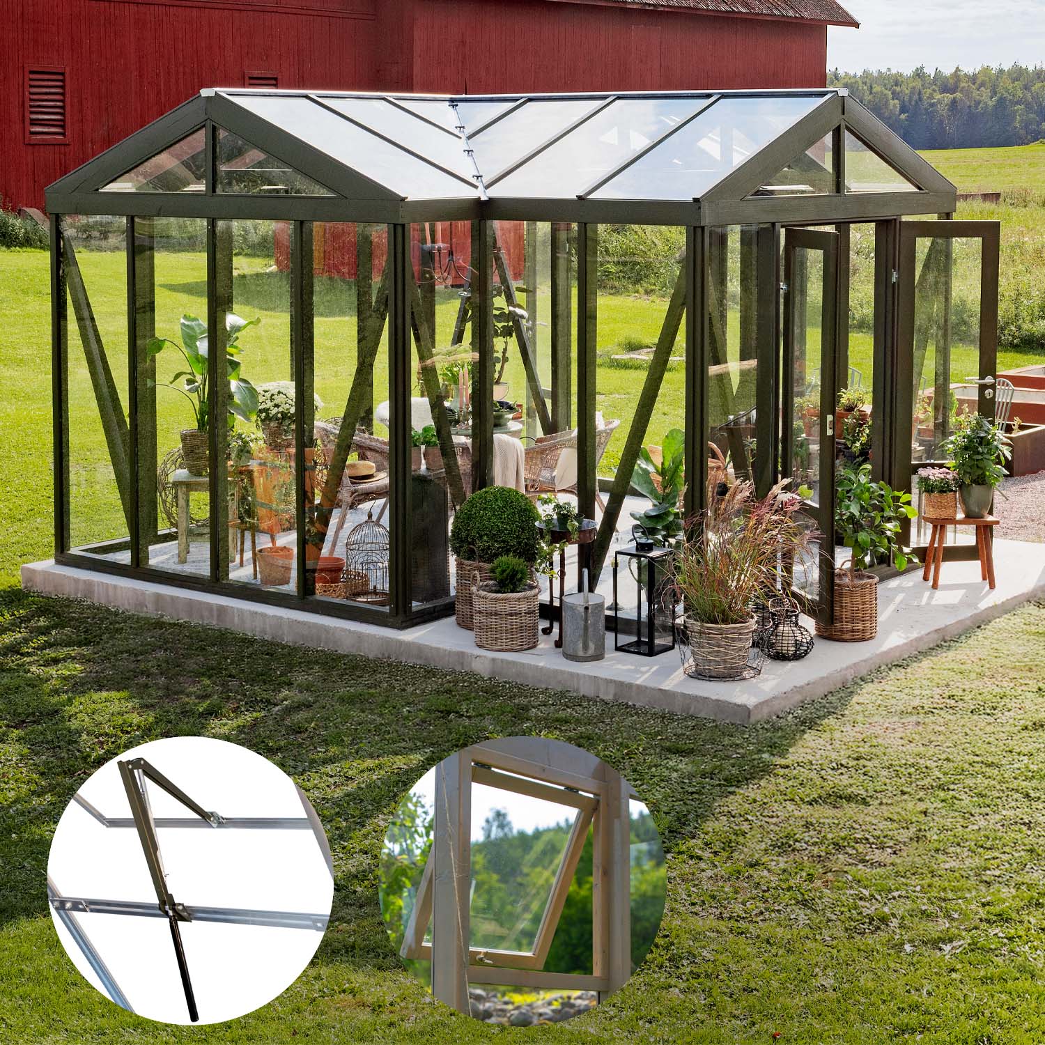 Drivhuset er designet i en vakker og tidløs stil som passer til de fleste hager, hustyper og terrasser. Hvis du har en ledig husvegg, murvegg eller garasjevegg i hagen din, så kan dette drivhuset være noe for deg. Spesielt hvis du ikke har de store områder som trengs for et stort frittstående drivhus. Med dette drivhuset vil du likevel kunne dyrke mye i hagen eller på uteplassen din.