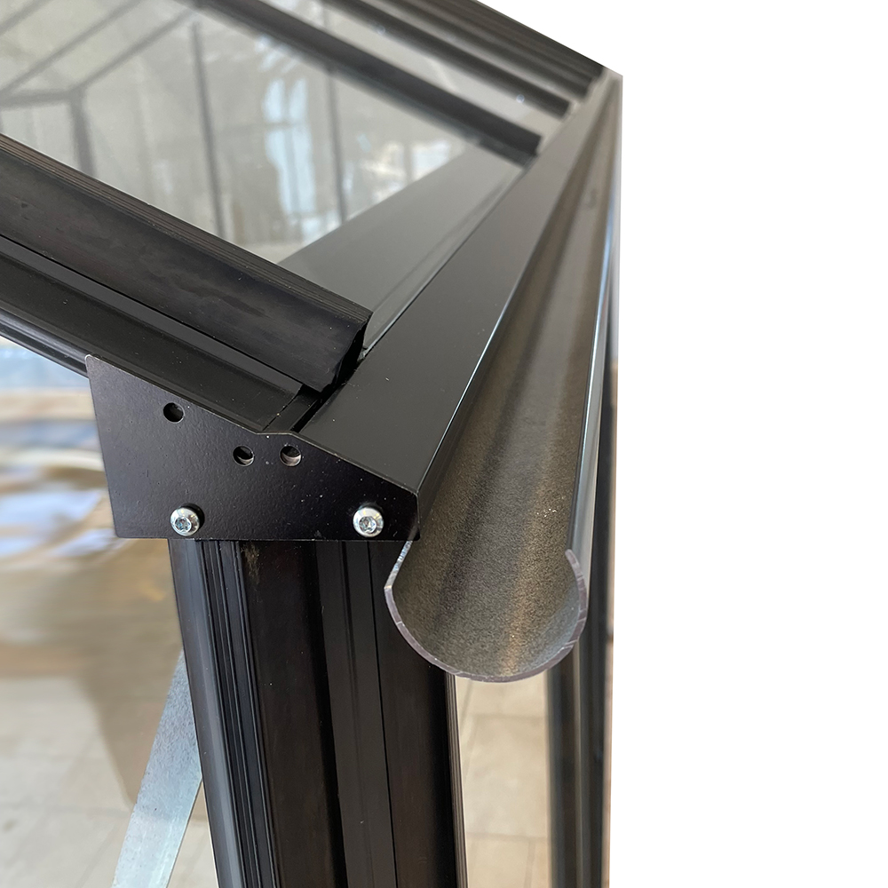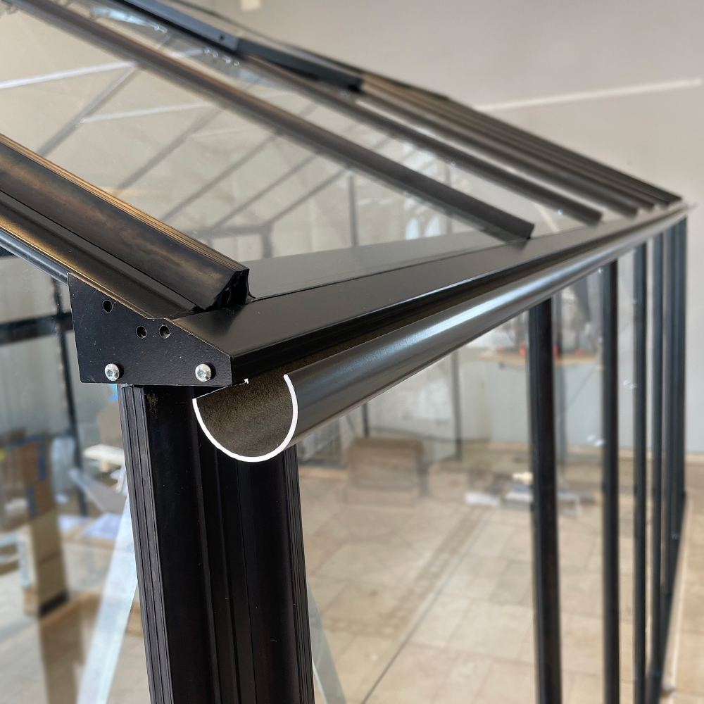Monteringen er enkel: rennekassettene skyves inn fra siden av drivhuset uten bruk av verktøy – raskt, enkelt og trygt. Du kan enkelt koble til 40 mm rør med standardkoblinger (medfølger ikke) for å lede bort eller samle opp regnvann.