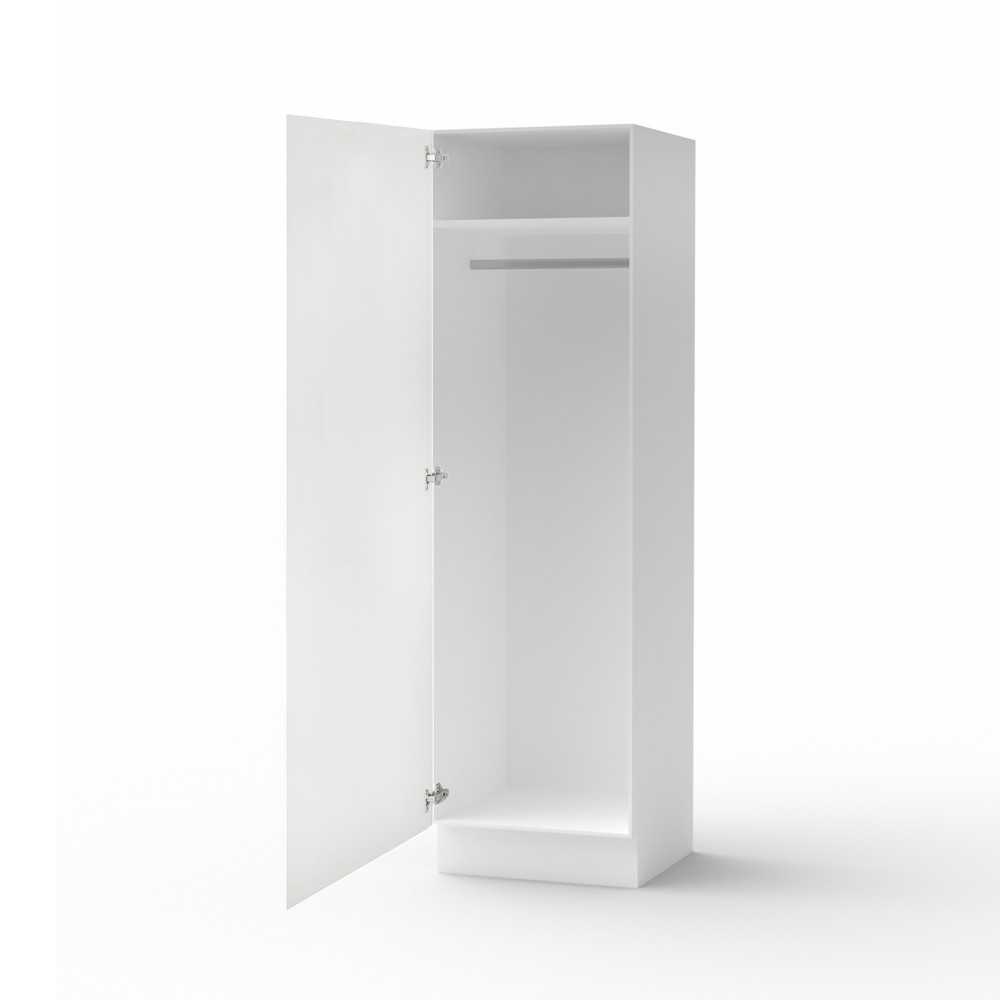 Garderoben inngår i vår serie Nord, en kolleksjon skapt for deg som liker enkelhet, funksjon og nordisk design. Den rene hvite overflaten gjør at skapet passer like godt på soverommet som i gangen eller gjesterommet. Skapet leveres ferdigmontert. Det eneste du trenger å gjøre er å montere døren, noe som også gjør at du selv kan velge om den skal være høyre- eller venstrehengslet.