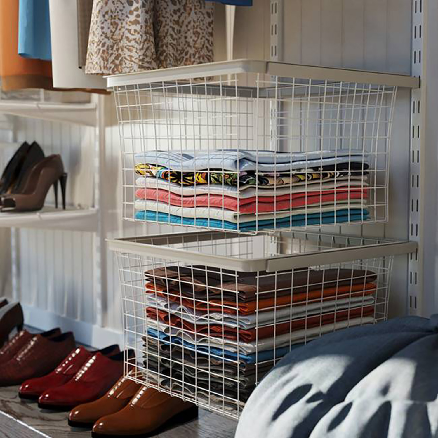Denne pakken inneholder alle komponentene som trengs for å lage en skreddersydd garderobeløsning. Det er henge- og veggskinner, braketter, trådhyller, stangholdere, garderobestang og trådkurver. Hver del er designet for å kunne kombineres med hverandre, og det er enkelt å komplettere med enda flere deler ved behov.