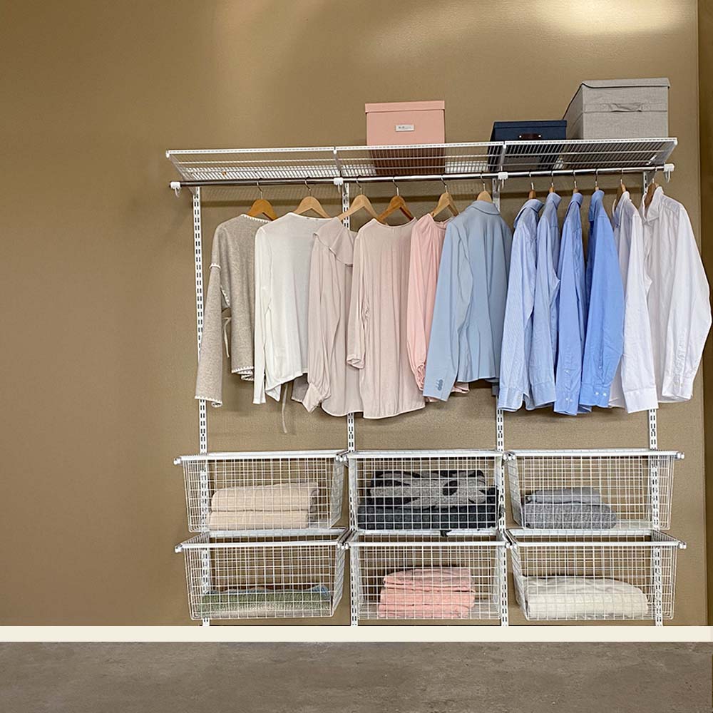 Denne pakken inneholder alle komponentene som trengs for å lage en skreddersydd garderobeløsning. Det er henge- og veggskinner, braketter, trådhyller, stangholdere, garderobestang og trådkurver. Hver del er designet for å kunne kombineres med hverandre, og det er enkelt å komplettere med enda flere deler ved behov.