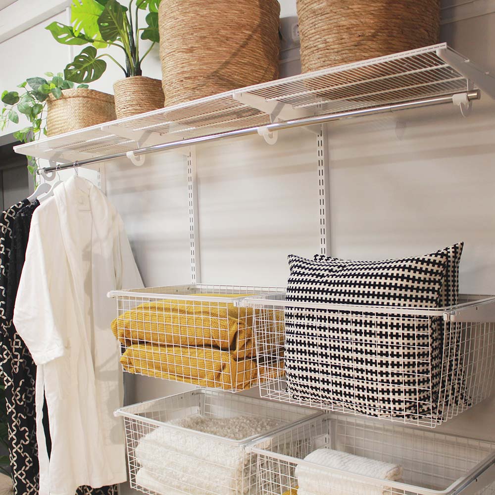 Selv om denne løsningen er tiltenkt å passe bak skyvedørspartiene dine, passer våre innredningspakker like godt i andre deler av hjemmet. Få orden i gangen, kontoret eller boden med dette allsidige oppbevaringssystemet.