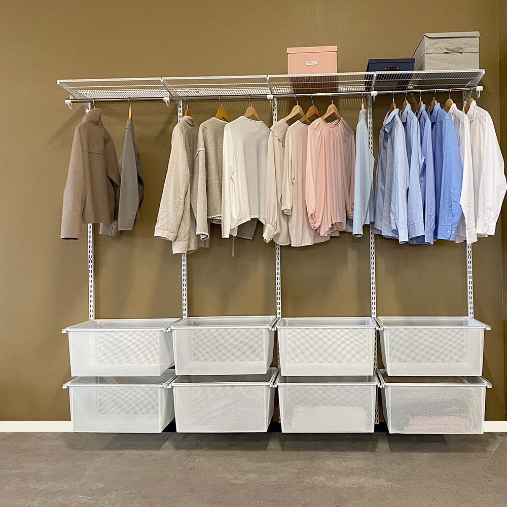 Denne pakken inneholder alle komponentene som trengs for å lage en skreddersydd garderobeløsning. Det er henge- og veggskinner, braketter, trådhyller, stangholdere, garderobestang og meshkurver. Hver del er designet for å kunne kombineres med hverandre, og det er enkelt å komplettere med enda flere deler ved behov.