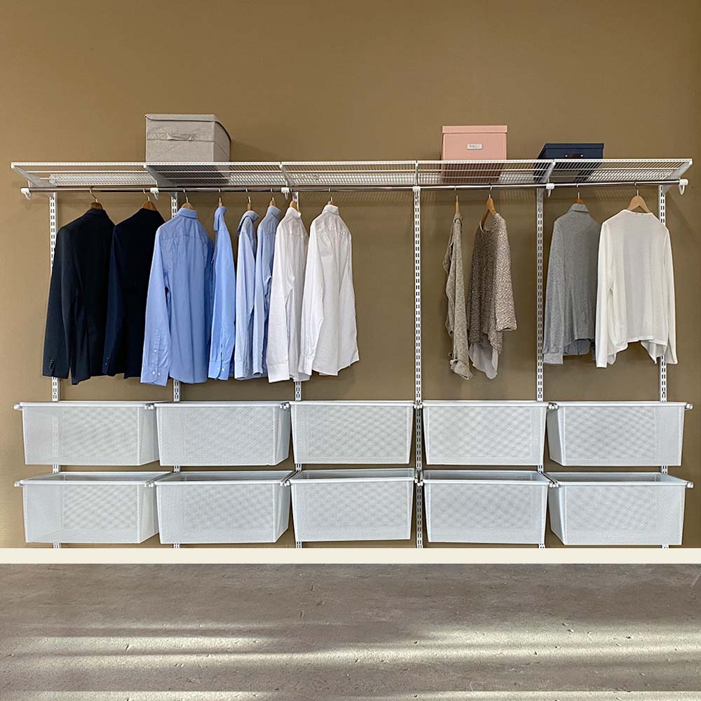 Denne pakken inneholder alle komponentene som trengs for å lage en skreddersydd garderobeløsning. Det er henge- og veggskinner, braketter, trådhyller, stangholdere, garderobestang og meshkurver. Hver del er designet for å kunne kombineres med hverandre, og det er enkelt å komplettere med enda flere deler ved behov.