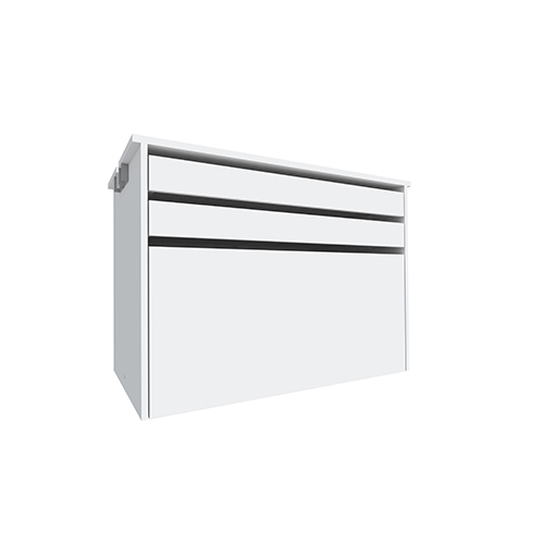 Hylleplan er i 19 mm hvit melaminbelagt sponplate. Skuffesider og fronter er 16 mm hvit, melaminbelagt sponplate. Skuffe med glassfront i herdet glass.