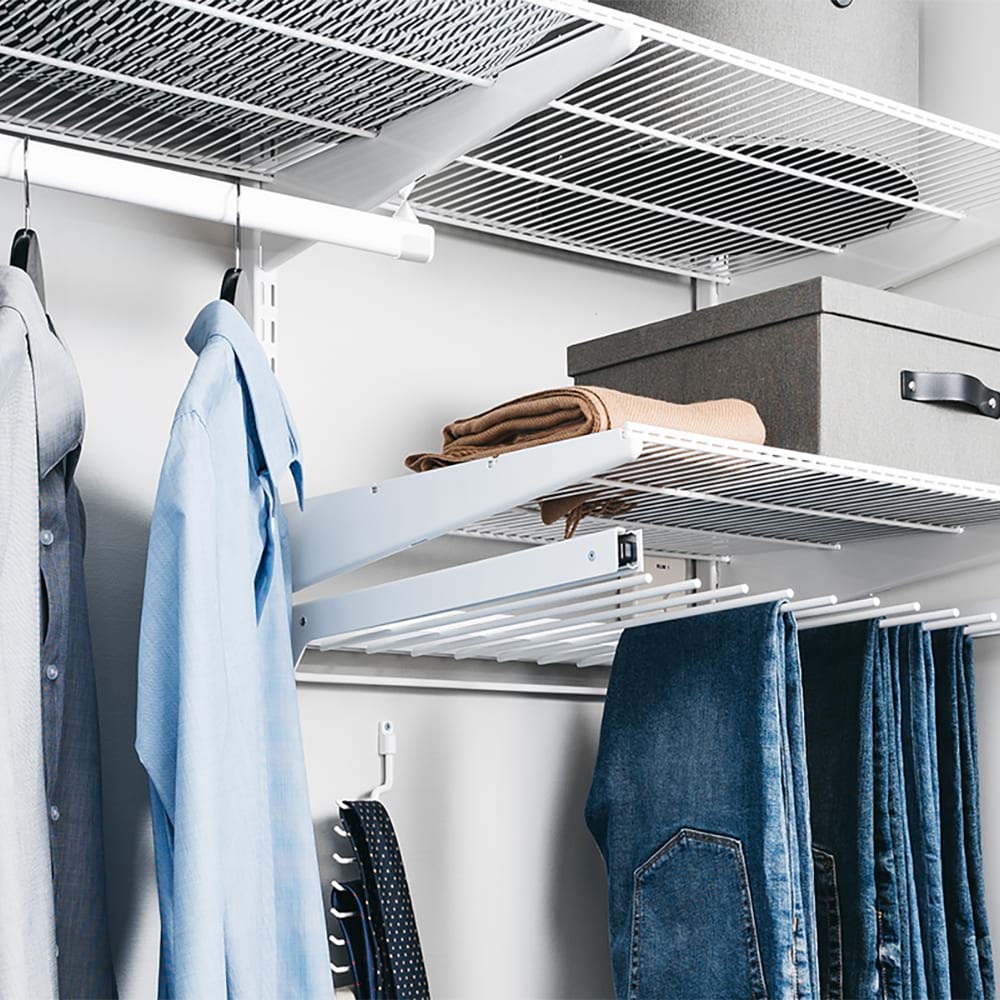 Klesstangsholder som festes i braketter for trådhyller, samt braketter for trehyller.