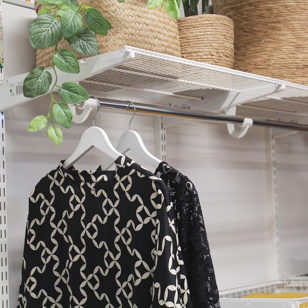 Selv om denne løsningen er tilpasset garderobeoppbevaring bak skyvedørspartier, passer innredningspakken like godt i andre deler av hjemmet. Skap orden i for eksempel gang, gjesterom eller kontor med dette fleksible oppbevaringssystemet.