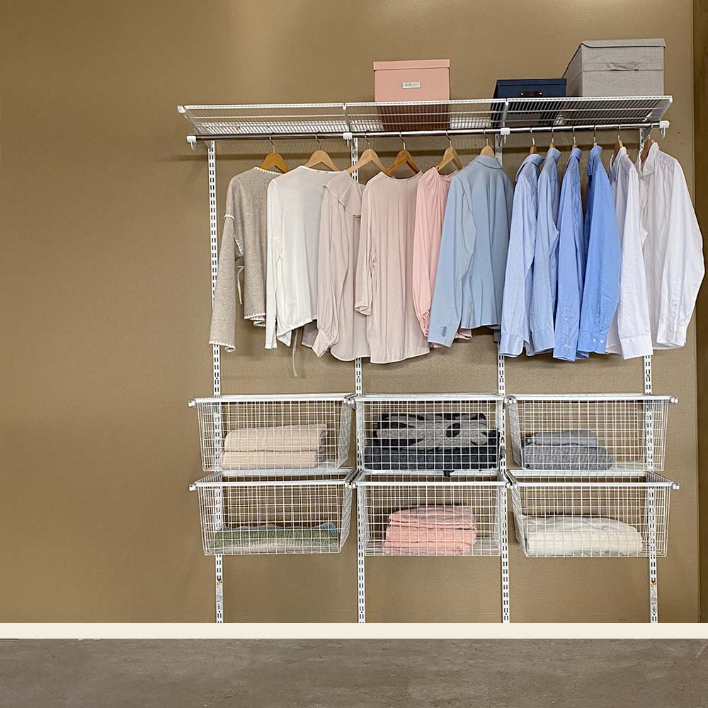 Denne pakken inneholder alle komponentene som trengs for å lage en skreddersydd garderobeløsning. Det er henge- og veggskinner, braketter, trådhyller, stangholdere, garderobestang og trådkurver. Hver del er designet for å kunne kombineres med hverandre, og det er enkelt å komplettere med enda flere deler ved behov.