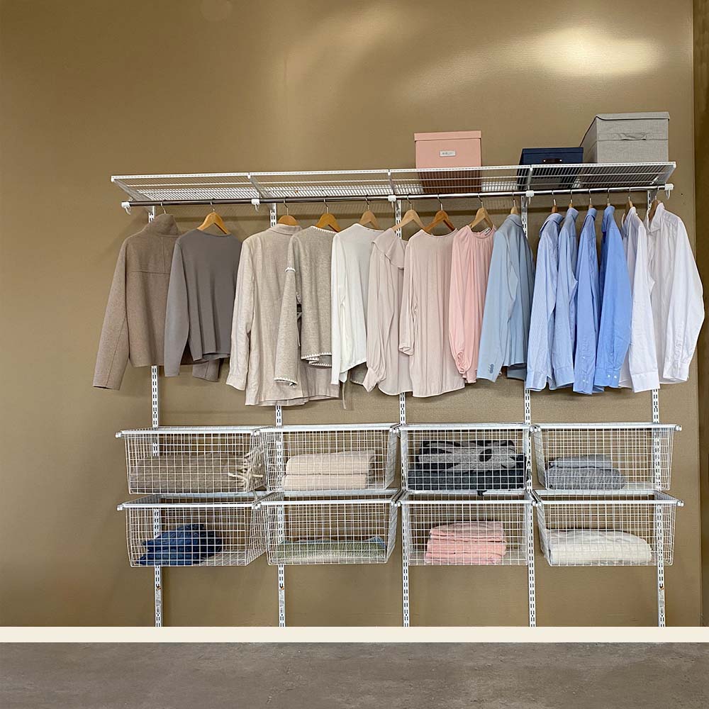 Denne pakken inneholder alle komponentene som trengs for å lage en skreddersydd garderobeløsning. Det er henge- og veggskinner, braketter, trådhyller, stangholdere, garderobestang og trådkurver. Hver del er designet for å kunne kombineres med hverandre, og det er enkelt å komplettere med enda flere deler ved behov.