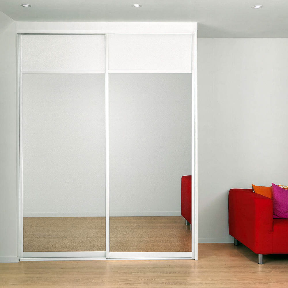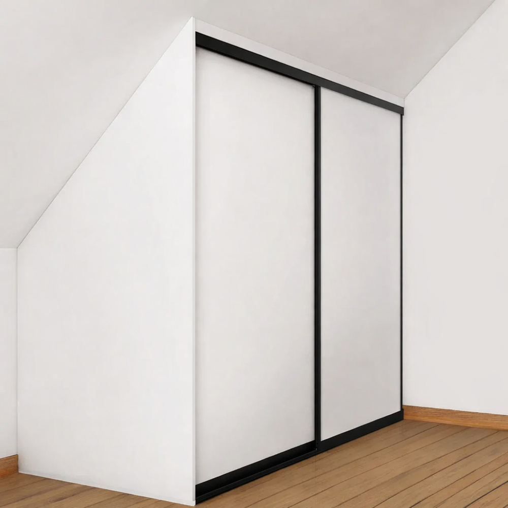 Skyvedørene leveres i 8mm malt og sporfrest MDF. Gripekant, tak og gulvskinne leveres i aluminium.
