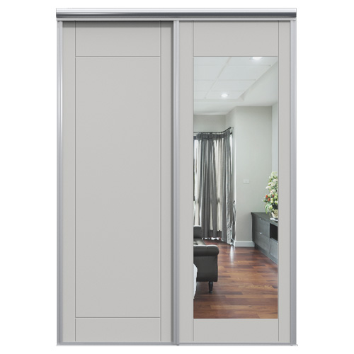 Skyvedørene leveres i 8 mm malt og sporfrest MDF. Sølvspeilet leveres i 4mm speilglass med en sikkerhetsfilm på baksiden. Gripekant, tak og gulvskinne leveres i aluminium.