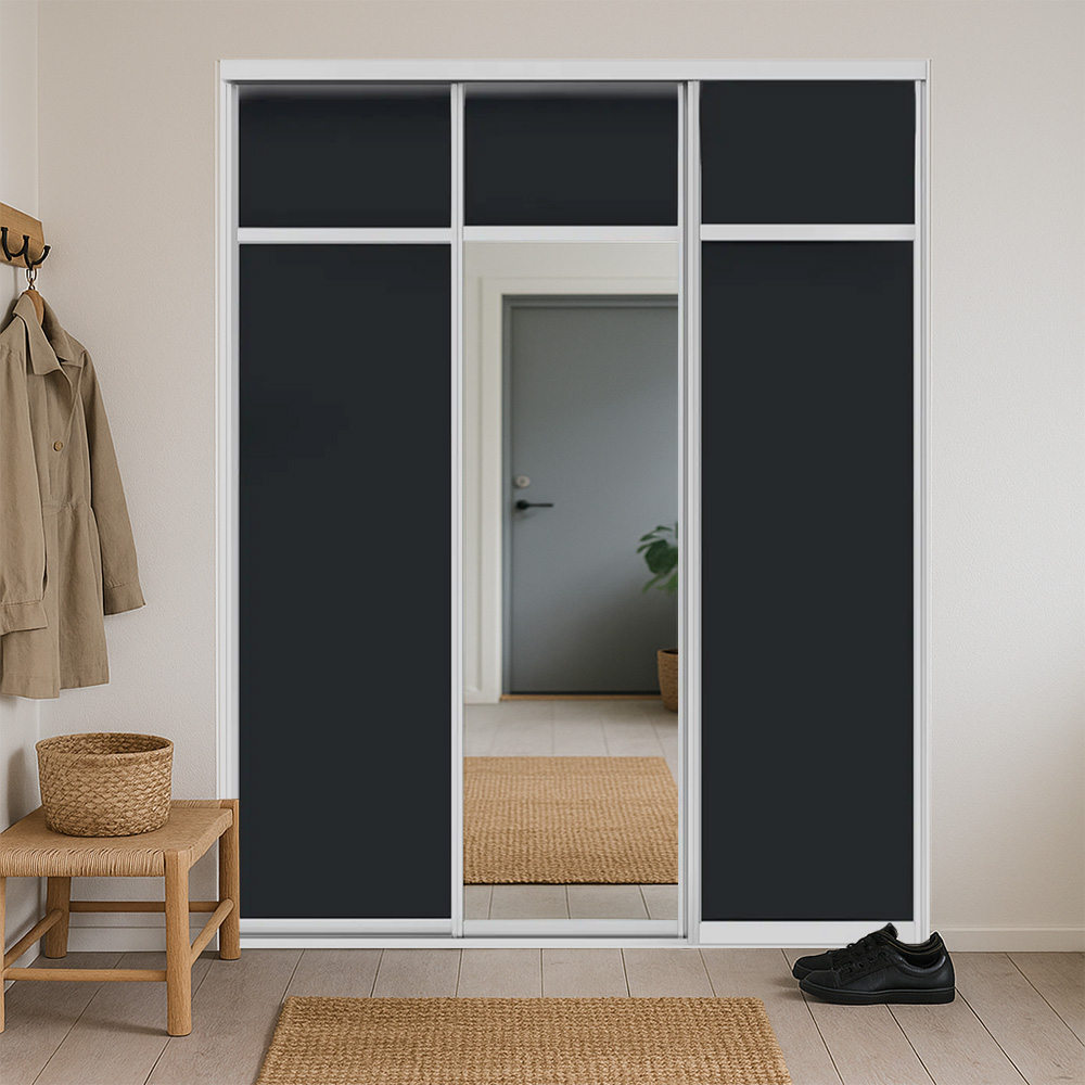 Speildøren består av 4 mm speilglass med sikkerhetsfilm på baksiden. De sort/hvite dørfeltene er laget av 10 mm melaminbelagt MDF. Gripelist, tak- og gulvskinner er i aluminium.