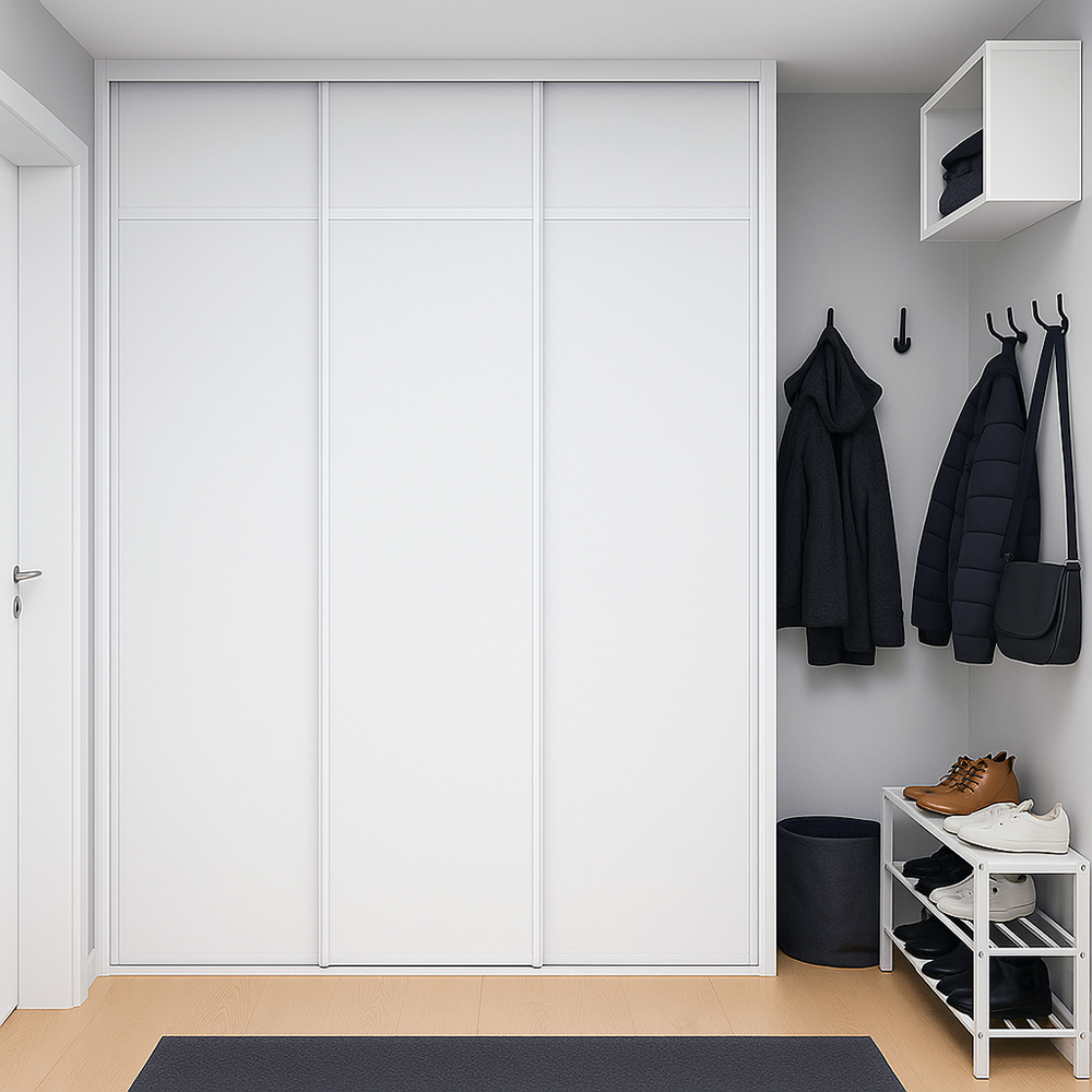 Skyvedørene er laget av 10 mm melaminbelagt MDF og de har håndtakslist, tak og gulvskinne i aluminium.
