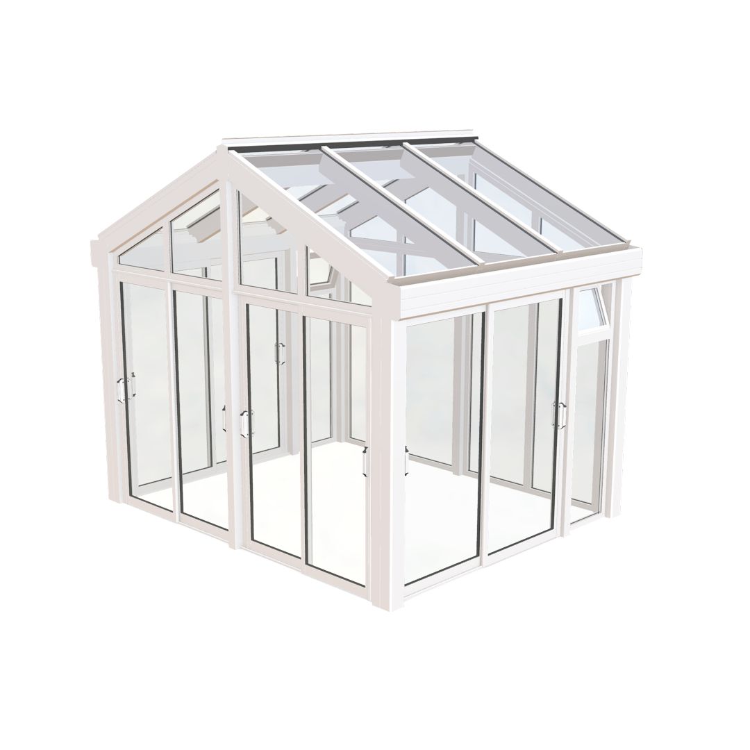 Hagestuen leveres alltid med en fast helglasset bakvegg og to faste partier med åpningsbare lufteluker i overkant, bakerst på sidene. Det er i tillegg et parti skyvedører på begge sider og to skyvedører i fronten med en midtstolpe i mellom. Her får du utsikt til alle kanter!