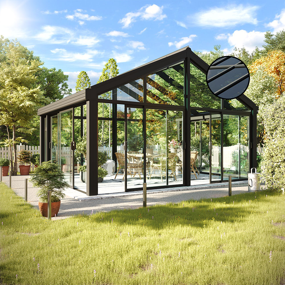 Et svarttonet glastak gir deg samme eksklusive uttrykk som et transparent, men reduserer både lysgjennomstrømning (hvor mye lys som slippes inn) og solenergi-gjennomstrømning (hvor mye av solens varme som kommer inn). Det er både estetisk tiltalende og gir høye nivåer av naturlig lys for en behagelig komfort i hagestuen din. Taket oppleves først og fremst mørkere utenfra enn innenfra.