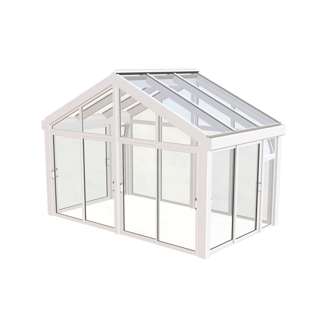 Hagestuen leveres alltid med en fast helglasset bakvegg og to faste partier med åpningsbare lufteluker i overkant, bakerst på sidene. Det er i tillegg et parti skyvedører på begge sider og to skyvedører i fronten med en midtstolpe i mellom. Her får du utsikt til alle kanter!