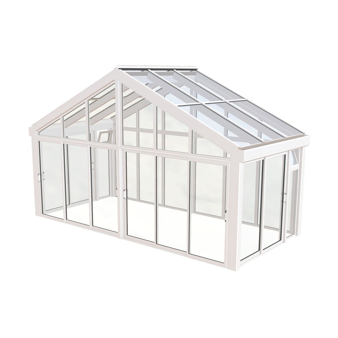 Hagestuen leveres alltid med en fast helglasset bakvegg og to faste partier med åpningsbare lufteluker i overkant, bakerst på sidene. Det er i tillegg et parti skyvedører på begge sider og to skyvedører i fronten med en midtstolpe i mellom. Her får du utsikt til alle kanter!