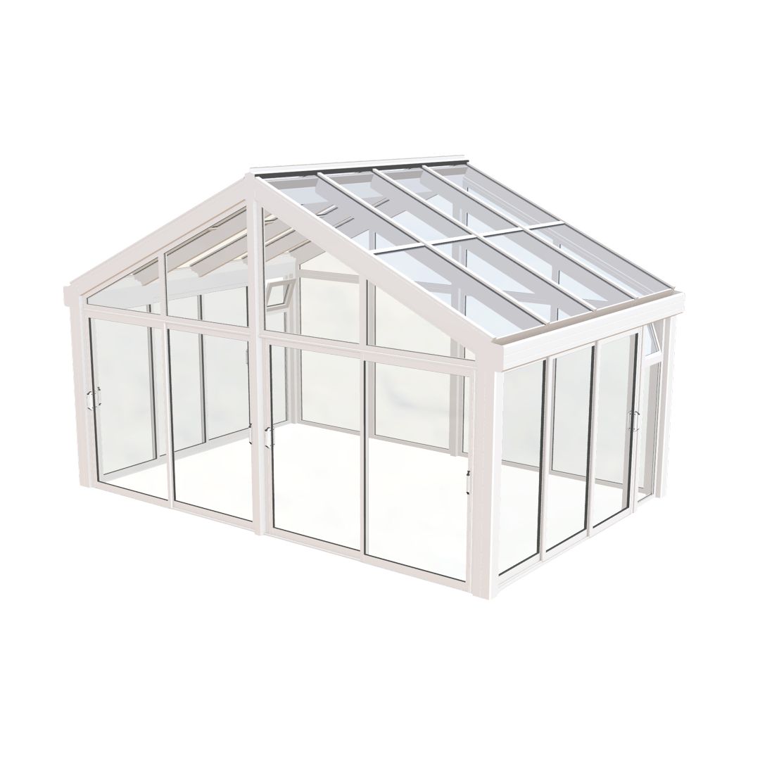 Hagestuen leveres alltid med en fast helglasset bakvegg og to faste partier med åpningsbare lufteluker i overkant, bakerst på sidene. Det er i tillegg et parti skyvedører på begge sider og to skyvedører i fronten med en midtstolpe i mellom. Her får du utsikt til alle kanter!