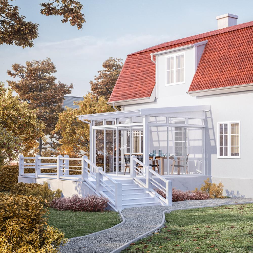 Hvis du ønsker å tilpasse hagestuen ytterligere med for eksempel faste partier, skyvevinduer eller en panelvegg i stedet for skyvepartier, kan vi hjelpe deg med det.