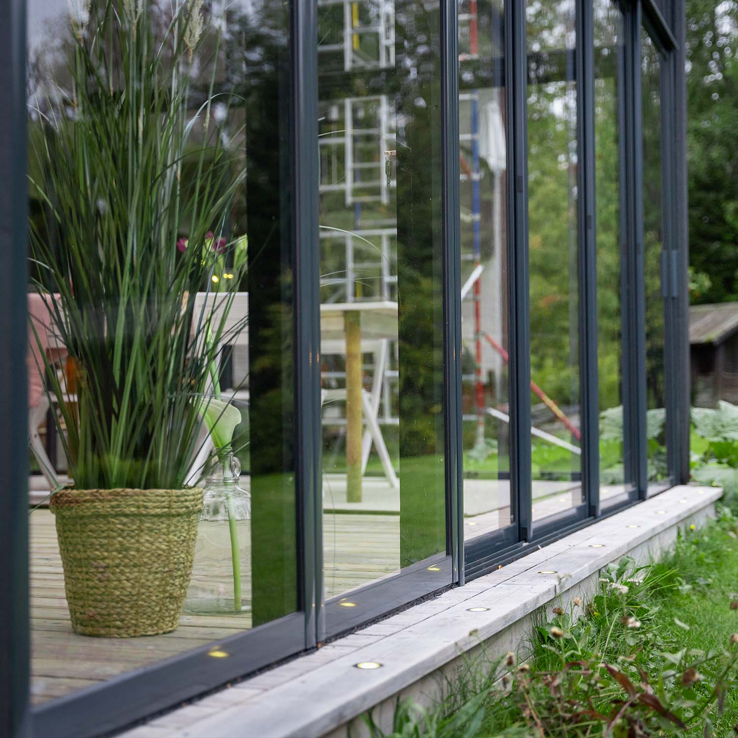 Dette skyvbare hagestuepartiet med Original Design karm har blitt forbedret og gjennomgått tøffe tester hos Sveriges Tekniske Forskningsinstitutt i Borås.