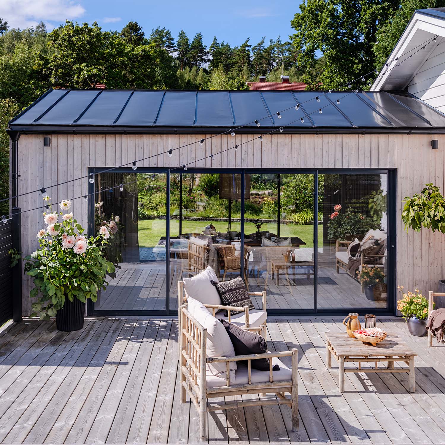 Dette skyvbare hagestuepartiet med Original Design karm har blitt forbedret og gjennomgått tøffe tester hos Sveriges Tekniske Forskningsinstitutt i Borås.