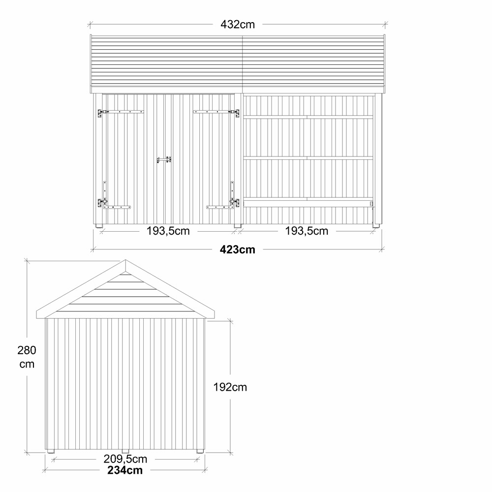 Den åpne delen gir rask tilgang til sykler, ved eller hageredskap, mens rommet bak dobbeldøren gir trygg og værbeskyttet oppbevaring.
