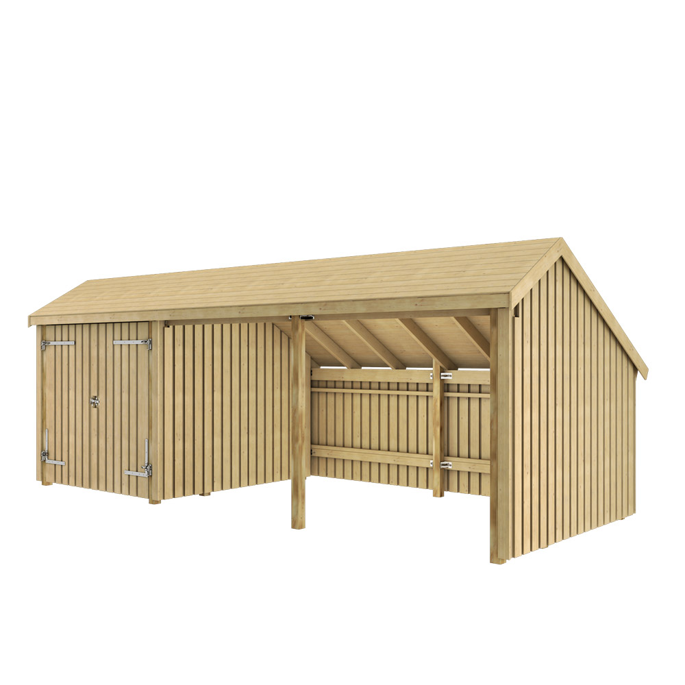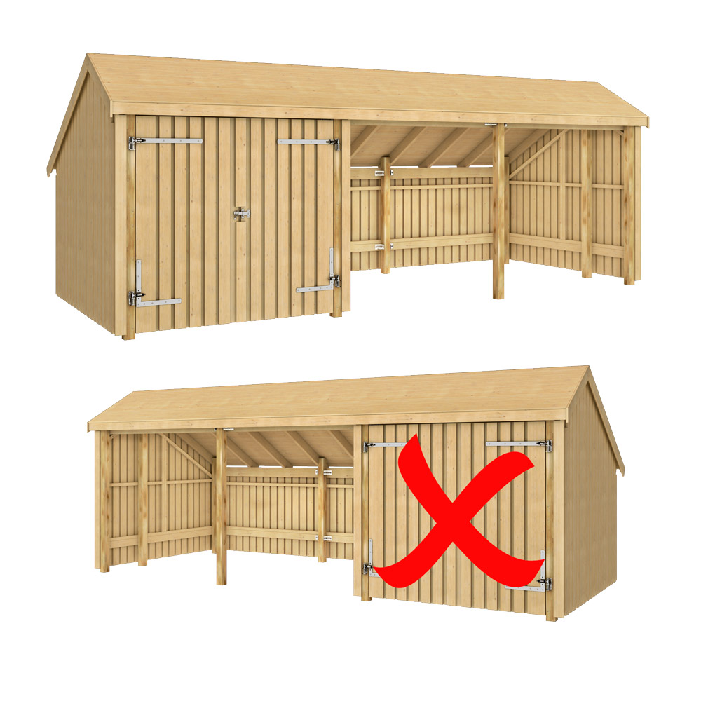 Den åpne delen inviterer til kreativ bruk – innred den som et koselig uterom eller en praktisk arbeidsplass. Den lukkede delen gir trygg oppbevaring for sykler, verktøy og maskiner.