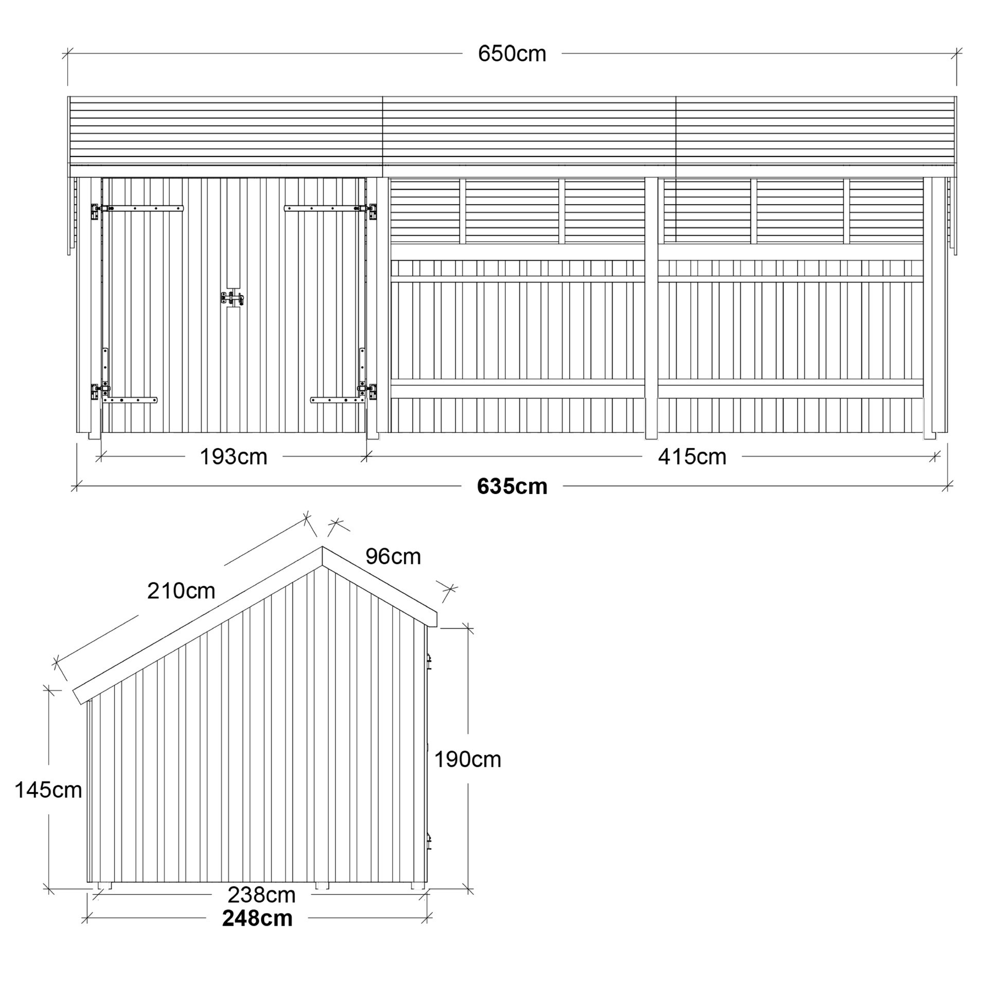 Multi hagehus 15,5 m² gir deg rom for både lagring og avslapning. Den smarte utformingen med åpen front og dobbeldør gir deg to funksjoner i ett bygg – et beskyttet oppbevaringsrom og et åpent overbygg for ved, møbler eller hageutstyr.
