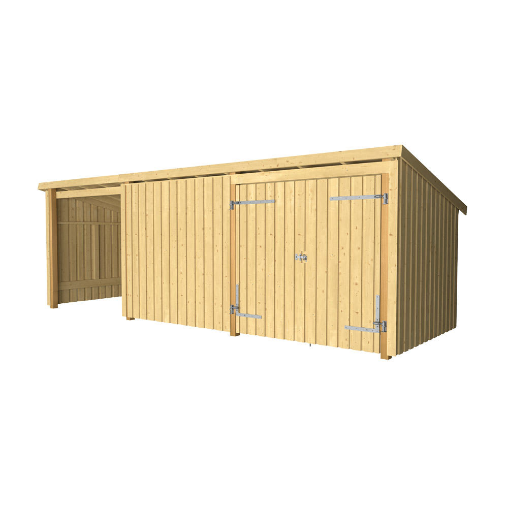 Nordic Multi hageskur 14 m² med dobbeldør og delvis åpen front gir deg både et sikkert oppbevaringsrom og et åpent, lett tilgjengelig område.