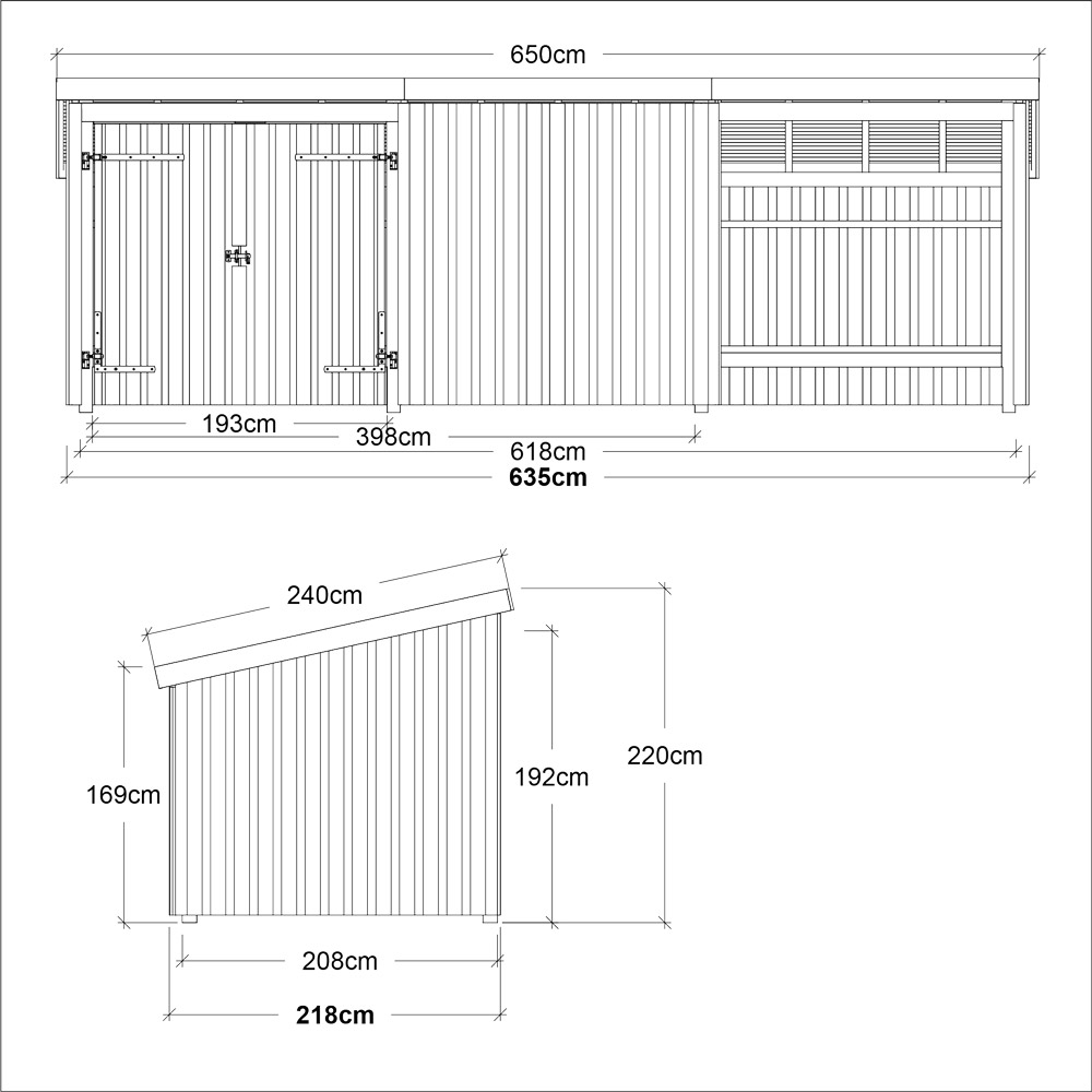 Perfekt for sykler, hageredskap, verktøy, maskiner eller ved. Den lukkede delen beskytter mot vær og vind, mens den åpne delen gir rask tilgang.