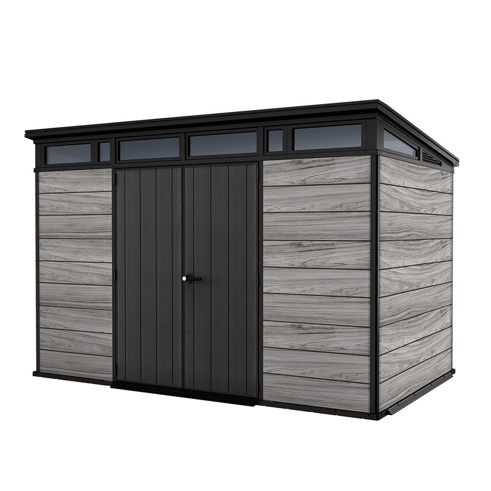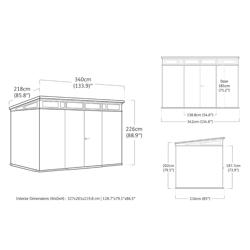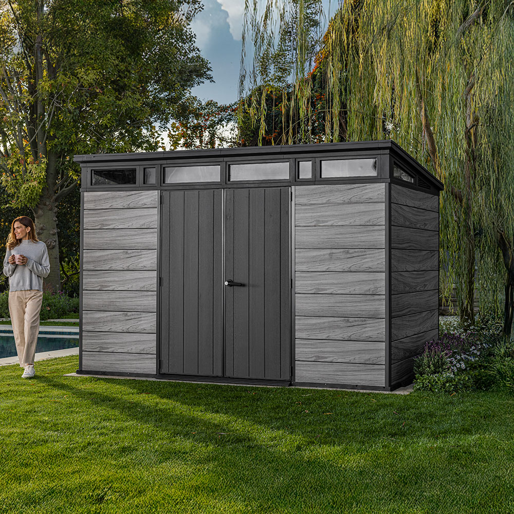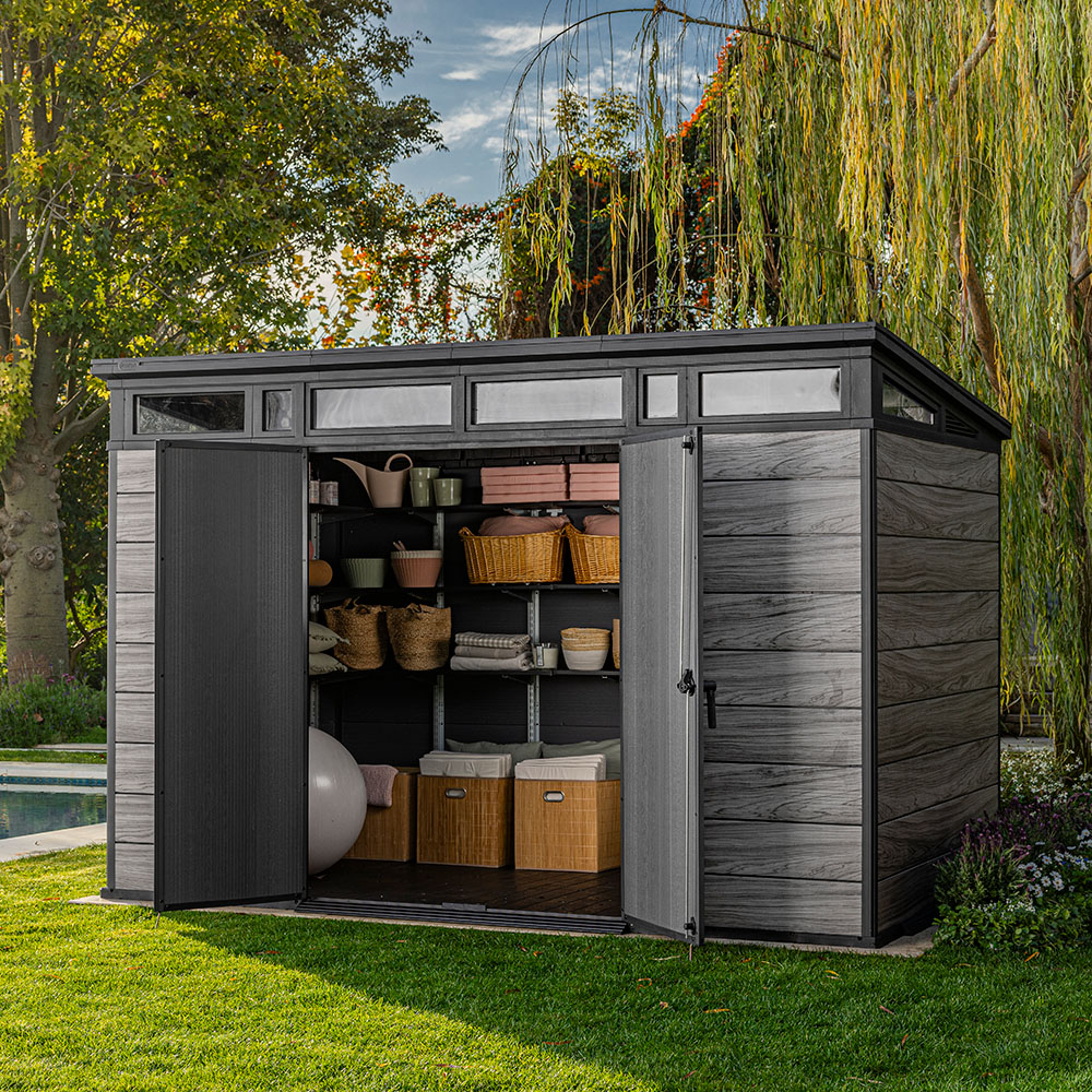 Innvendig får du en imponerende kapasitet på 13,7 m³ – perfekt for alt fra sykler og hageutstyr til en fullstor sittegressklipper. Det solide gulvet tåler tunge gjenstander, og med et valgfritt Keter Shelf Kit kan du enkelt organisere innholdet på en ryddig og funksjonell måte.